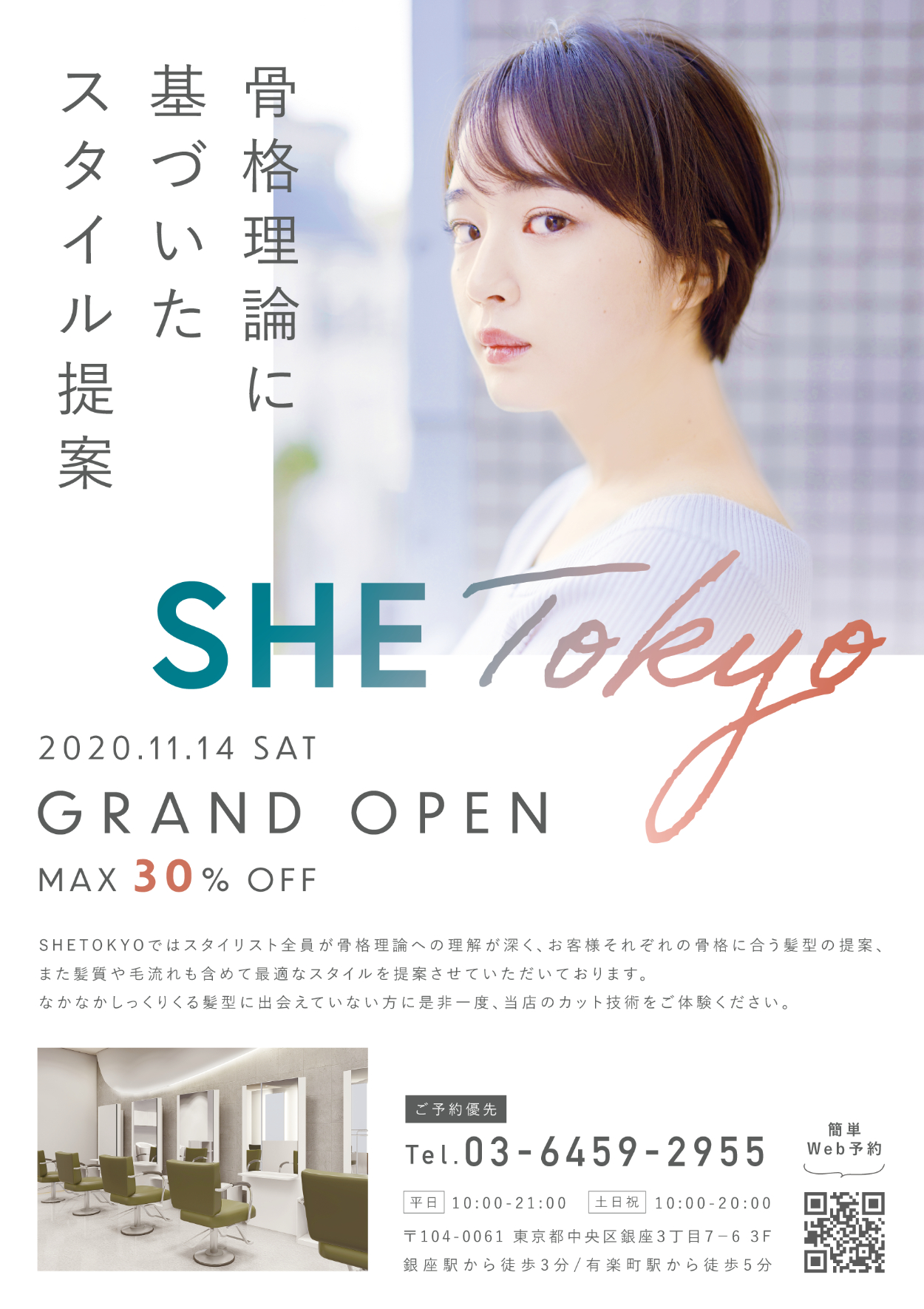 SHE Tokyo(架空)▶︎ 銀座に拠点を構える、骨格理論に基いたスタイル提案が売りの美容室。オーダーしていただいた髪型をそのまま再現するのではなく、一人ひとりの骨格や髪質に合わせて最大限似合うようにカスタマイズし仕上げることを得意としている。スタイリストは皆モデル御用達の有名店で腕を磨いた実力派。