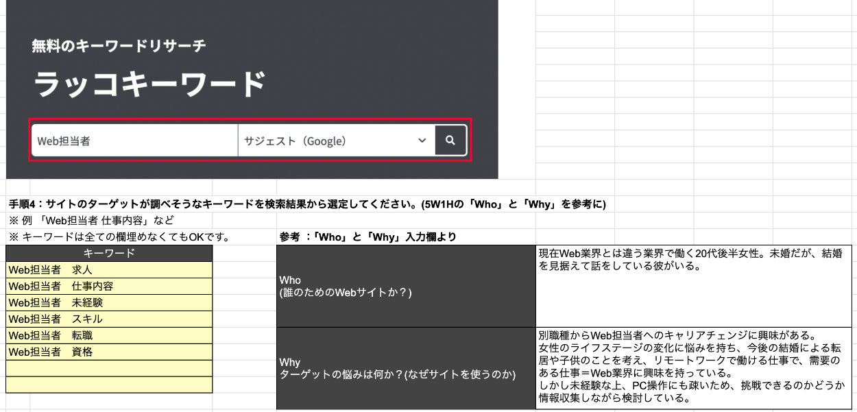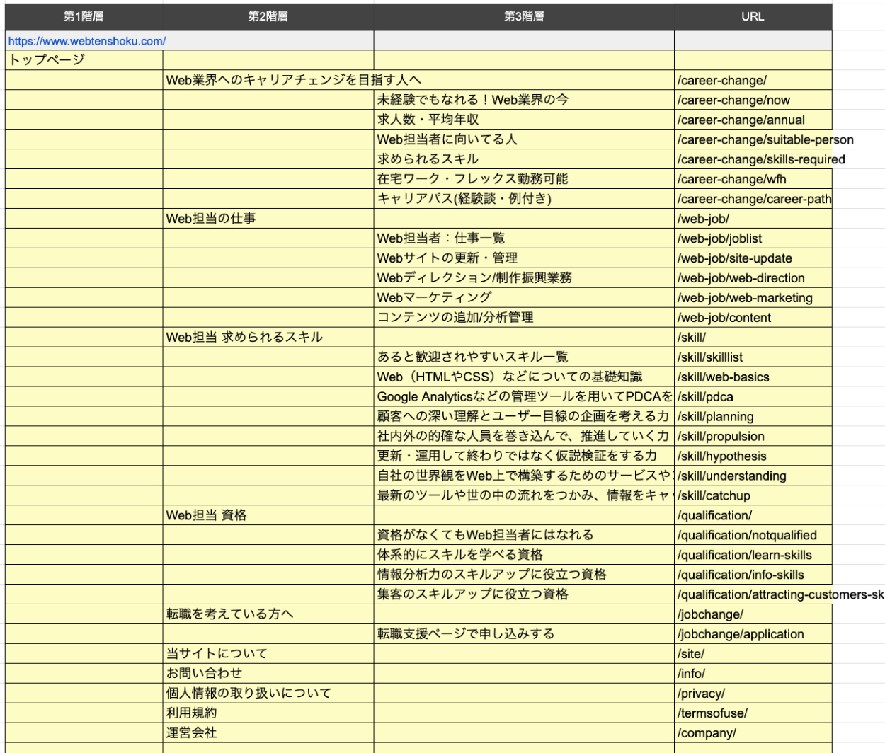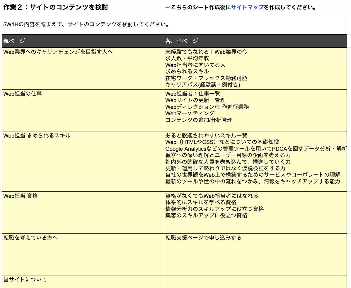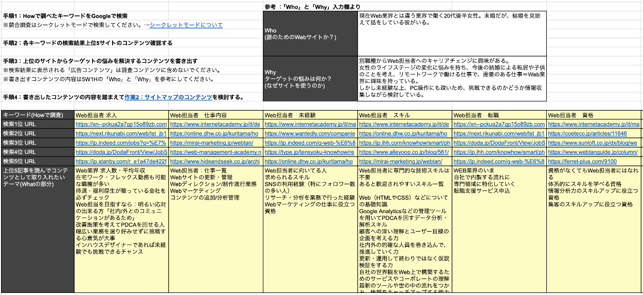 そしてターゲットの悩みに沿ったキーワード調査(「web担当者 スキル」「web担当者 仕事内容」)を行った上で、コンテンツ調査を行い、サイトマップコンテンツに落とし込んでいます。