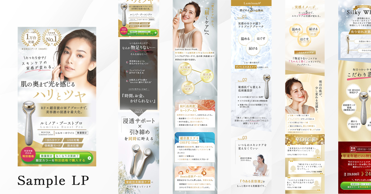 ■制作のポイント:商品カラーに合わせ、ゴールド・白・シルバーを基調にしたカラーにしました。キレイめな高級感のある世界観で、丁寧に仕上げました。