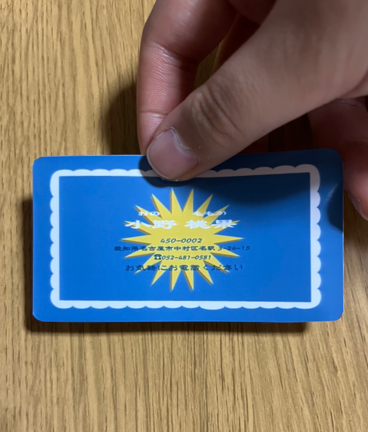 水色といえば空ということで、空をイメージした名刺を作ると決め、文字が書かれている周りを雲で囲み、あくまでも名刺なので文字を邪魔しない程度に、背景にはあえて抽象的な形の太陽を入れています。この空をイメージしたものに可愛いフォントを合わせても、もちろんしっくりくるのですが、ここはどうしても個性を出したかったので、中国っぽいフォントをセレクトして取り入れました。私は台湾にあるレトロな看板のデザインがすごく好きなので、空をイメージした背景と合間っていい感じに自分らしさを出せたのではないかと思います。