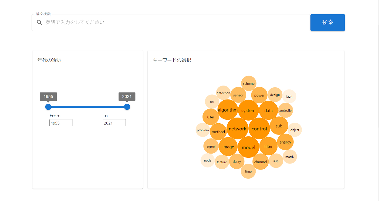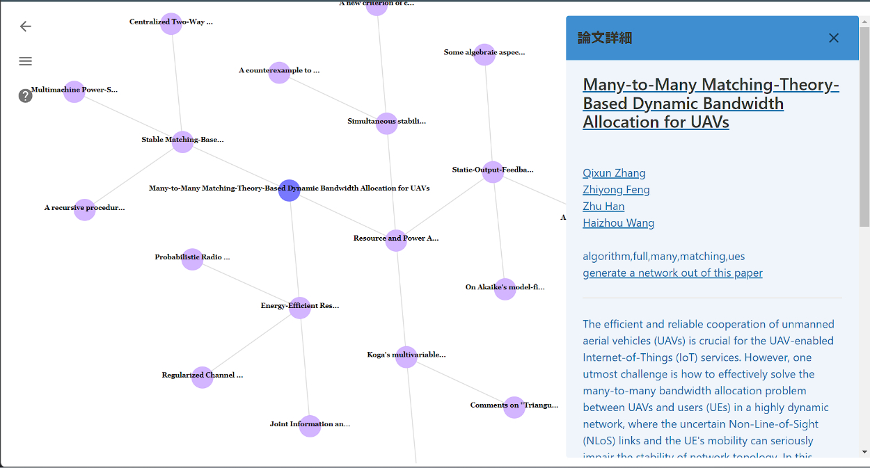 近年,技術の進歩が顕著となる中で,日夜多くの研究が行われ,論文が作成・提出されている.このような研究をするためには先行研究や論文を探す必要がある.論文を探索する中で,従来の論文探索サイトではフリーワードによる検索が基本となっており,使用者側に大きな負担がある.