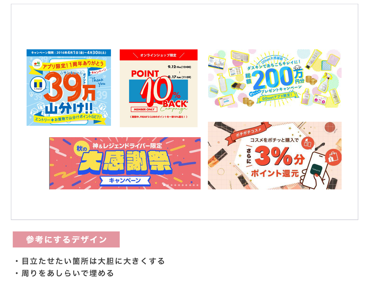 - さまざまな商品があるため、特定の商品だけを感じさせるのはNG。文字だけでお得感やワクワク感を伝える。色やフォントは特に指定なし。