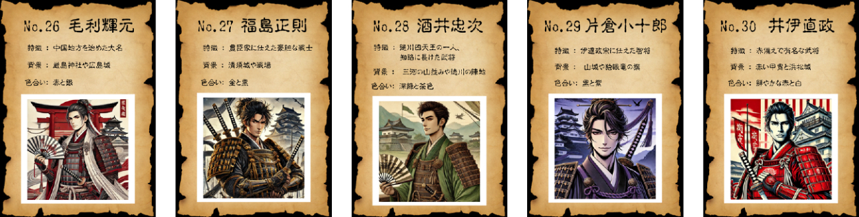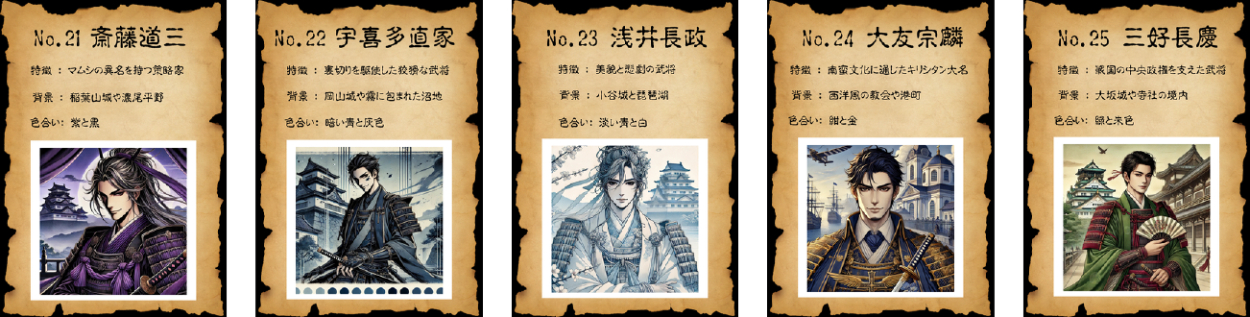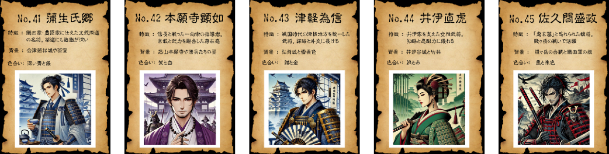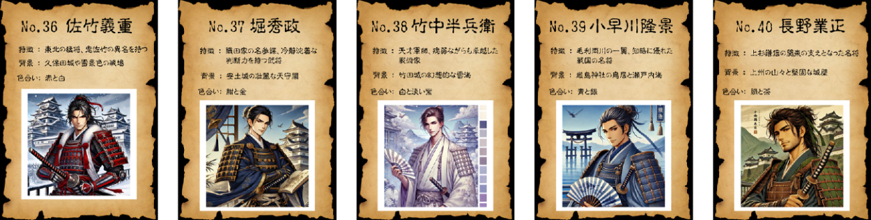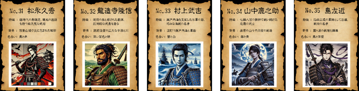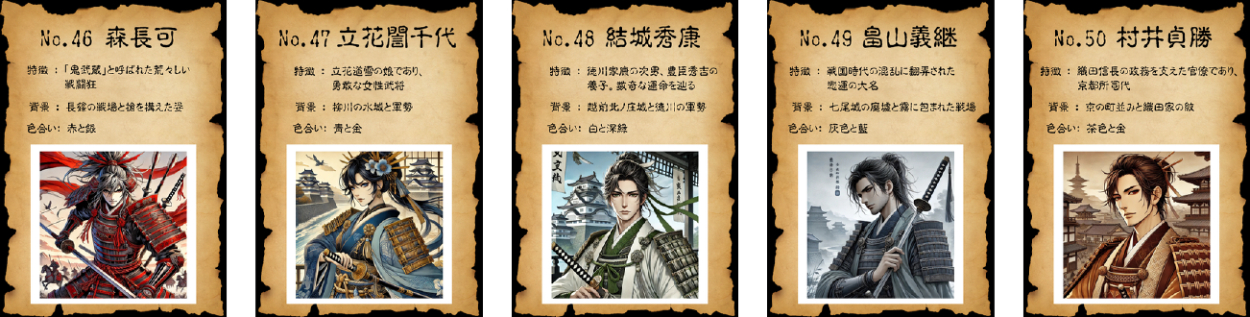 戦国時代の名将50人をテーマに、AIを活用したイラスト生成とカードデザインを組み合わせたビジュアル作品を制作しました。