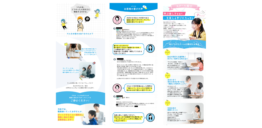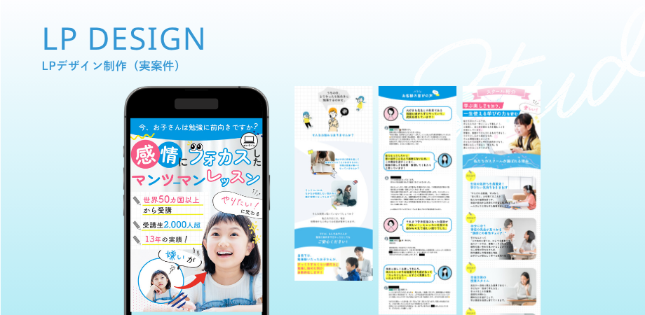 ・お客様の声部分はボリュームも多いパートなので、アイコンと吹き出しで幅広い層の声があることが伝わるようにデザインしました。優心オンライン様のサービスの大きな特徴である、「楽しい!」を第一にする学習スタイルのメリットが伝わるように作成しました。