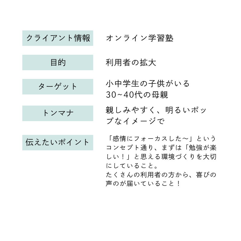 ・「小中学生のこどもを持つ母親」というターゲットに響くよう、全体的にPOPで明るいイメージに仕上げました。