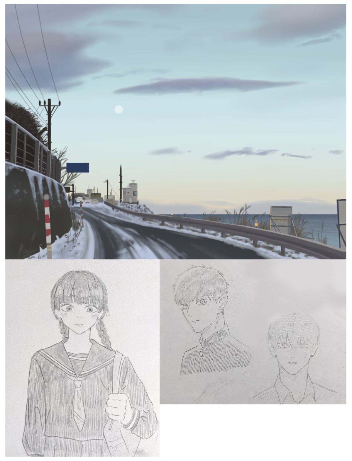 オリジナルイラスト 制作物 木原 咲子 学生 OVERVIEW 入学前に描いていたオリジナルのイラストです。 使用ソフト:ibisPaint X制作期間:2021年~2023年昔から、風景や人物を描くことが多かったです。入学前の大変だった時期も、絵を描きたい気持ちが収まらず、上の風景画に長く取り組んでいました。