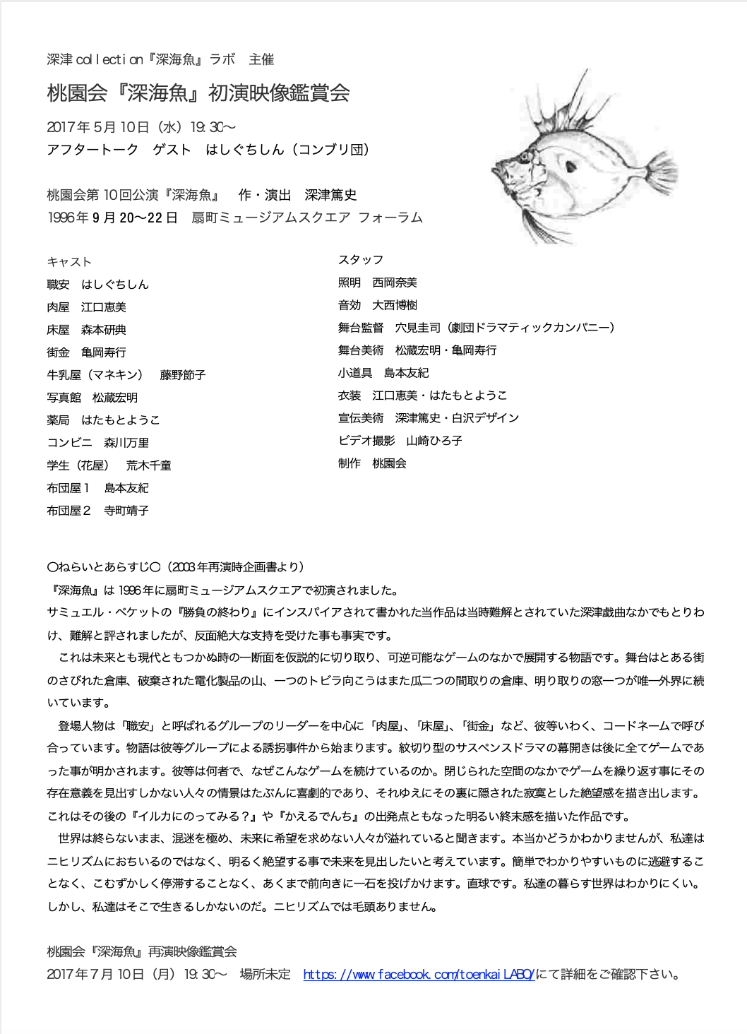 2017年4月〜2018年3月『深海魚』上演までの一年間、研究会を開いて戯曲を丁寧に読み解き、理解を深めていこうという企画。(深海魚ラボ研究員)