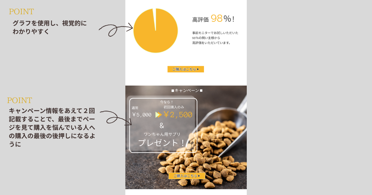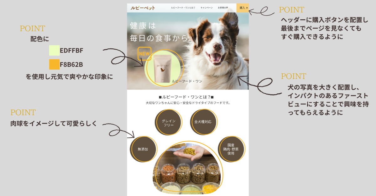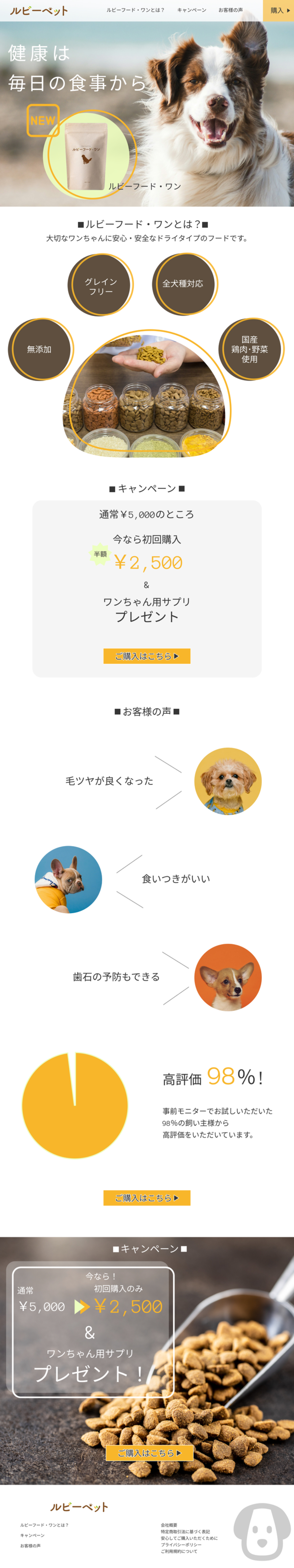 愛犬の健康管理フードになるので、かわいい元気な印象のあるLPをお願いいたします。