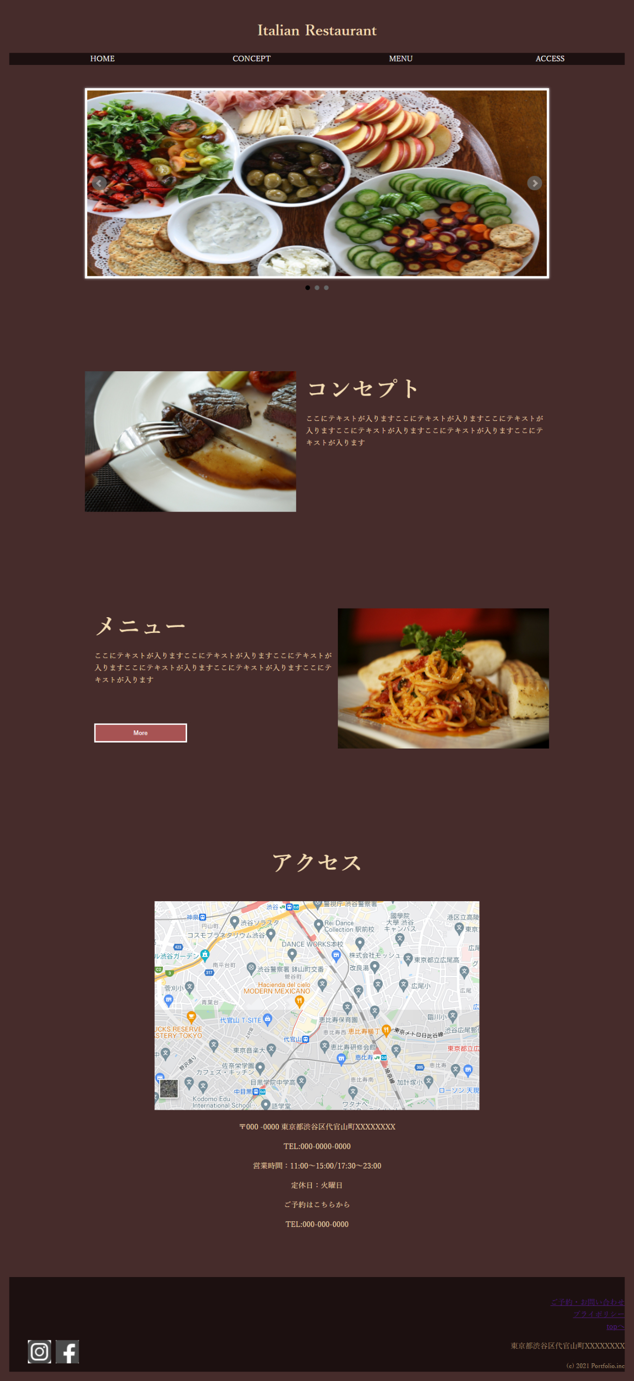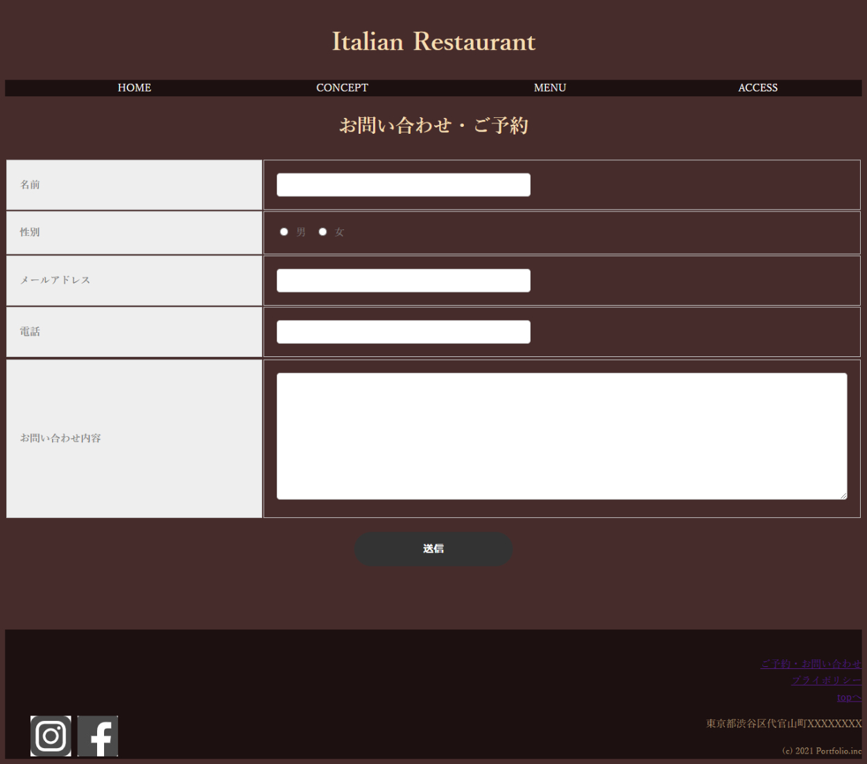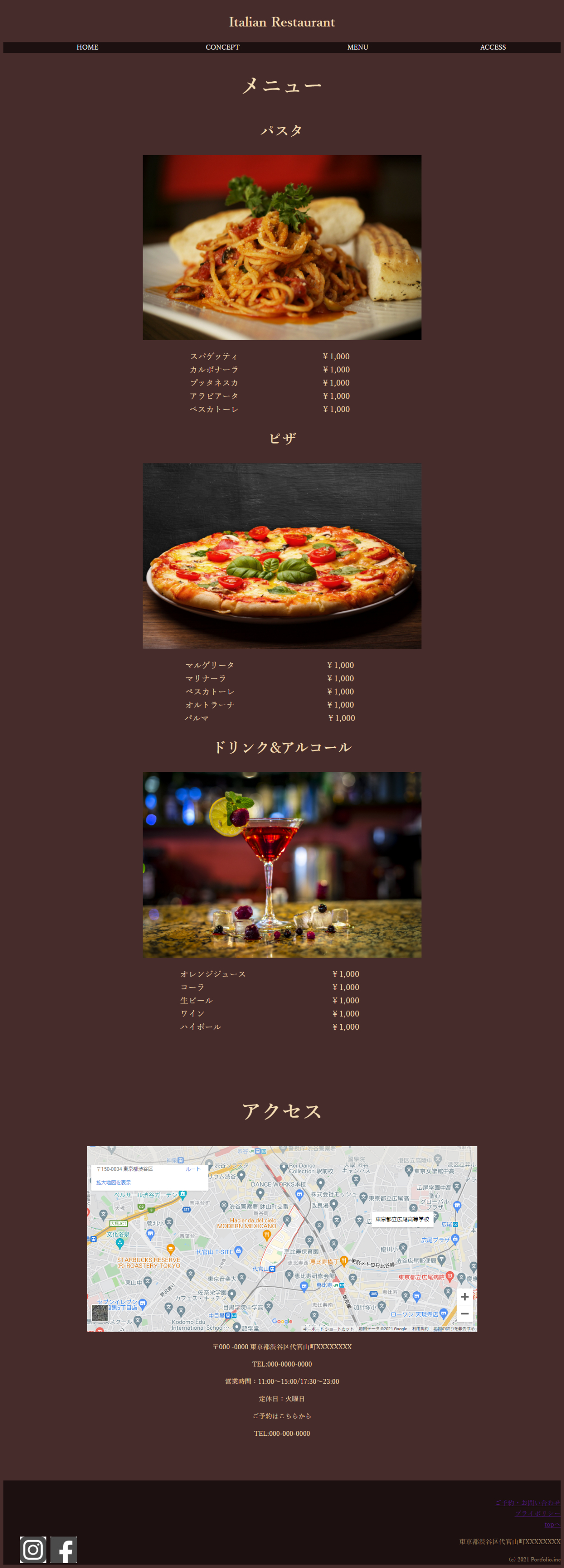 コンセプト、メニューはJavaScriptを使用して画面をスクルールするとポップアップするようにしました。