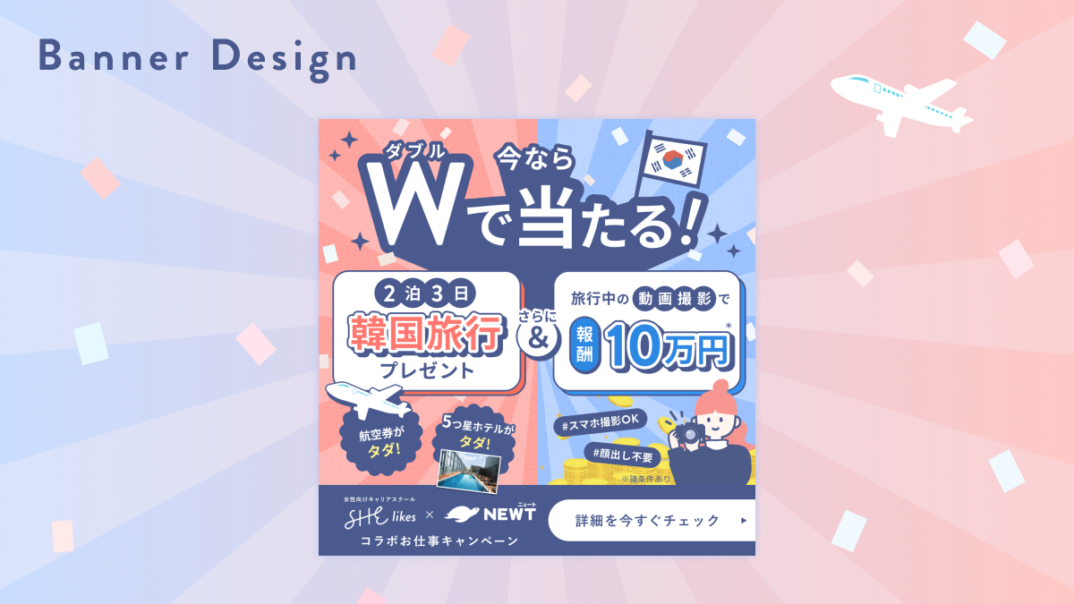 SHE株式会社様のサービス“SHElikes”のSNS広告バナー制作。 マーケティングチームからの要件とラフを元にデザインをしました。