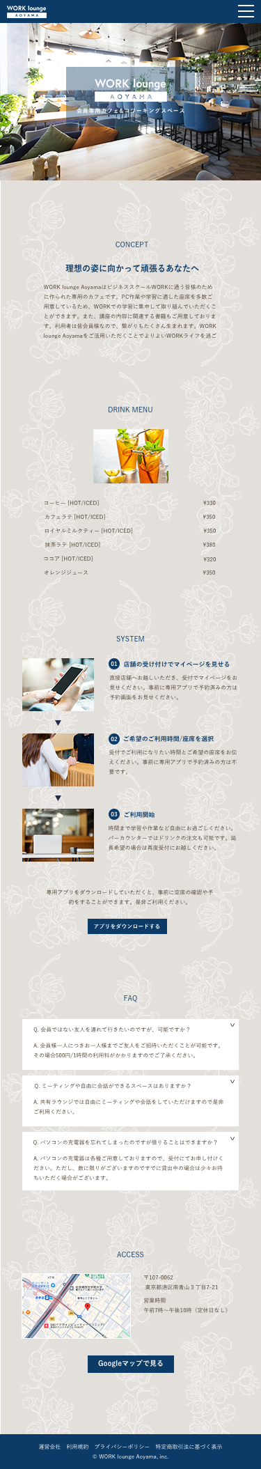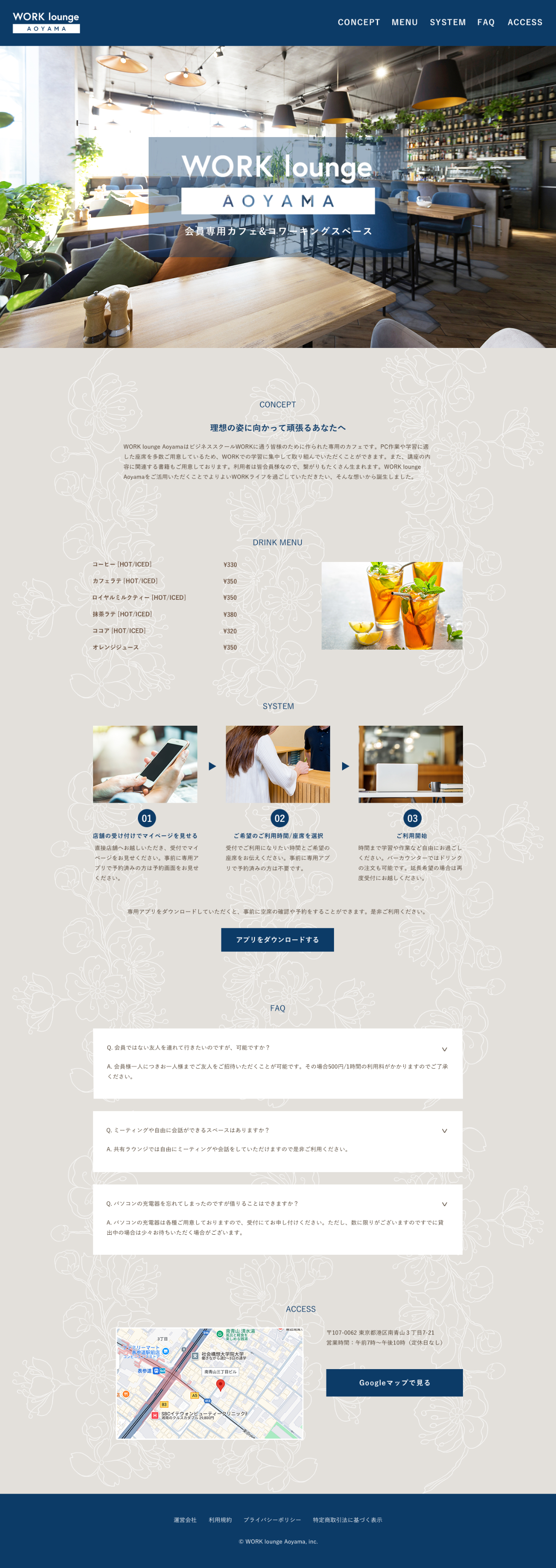 SHElikes MULTI CREATOR COURSEの課題で、キャリアスクール会員様向けのカフェ&コワーキングスペーのLP制作に取組みました。クライアントからの要件書とワイヤーフレームを元に、PCとSPののデザインカンプを制作しました。(制作時間:30時間)