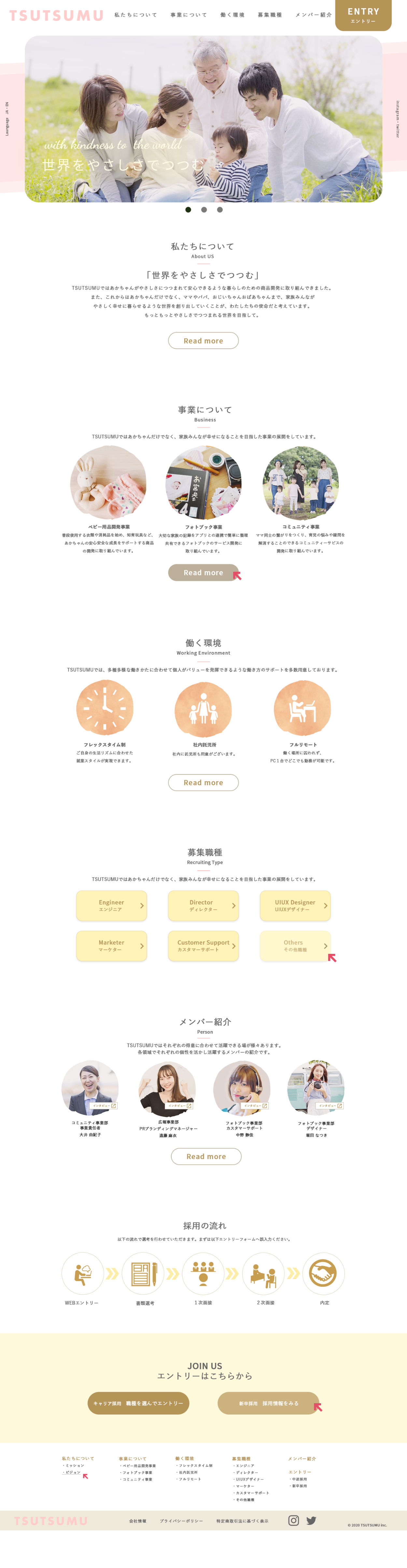 SHE株式会社のMulti Creator ProjectにてLP作成に取り組みました。 家族を優しくつつむ、をテーマとした事業のTSUTSUMUという会社(架空)の採用LPを作成しました。