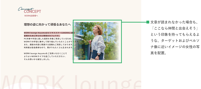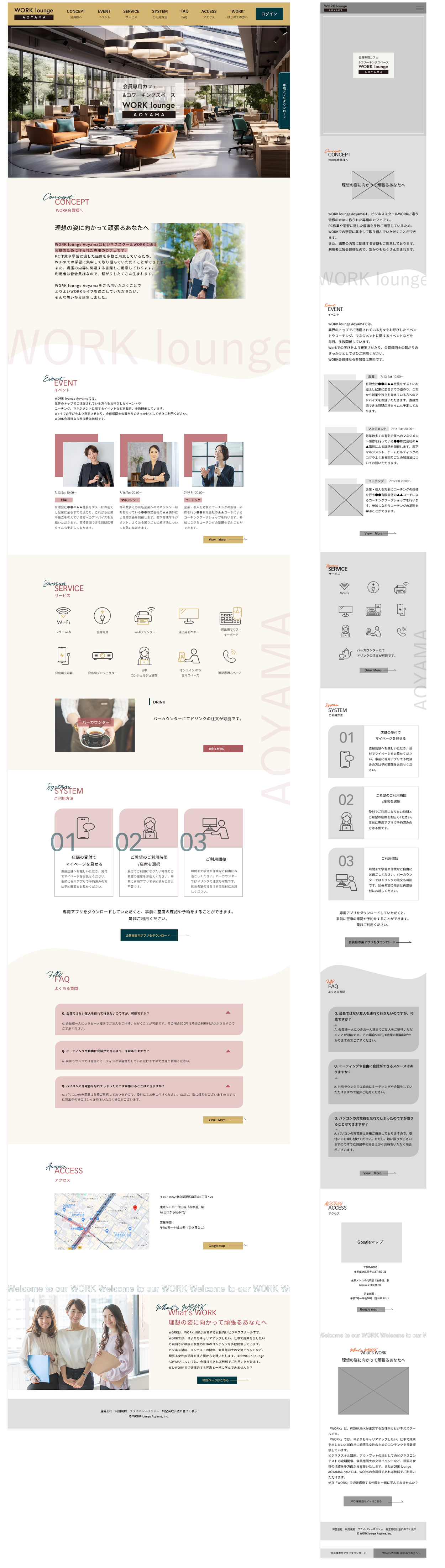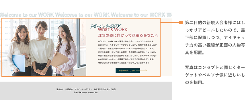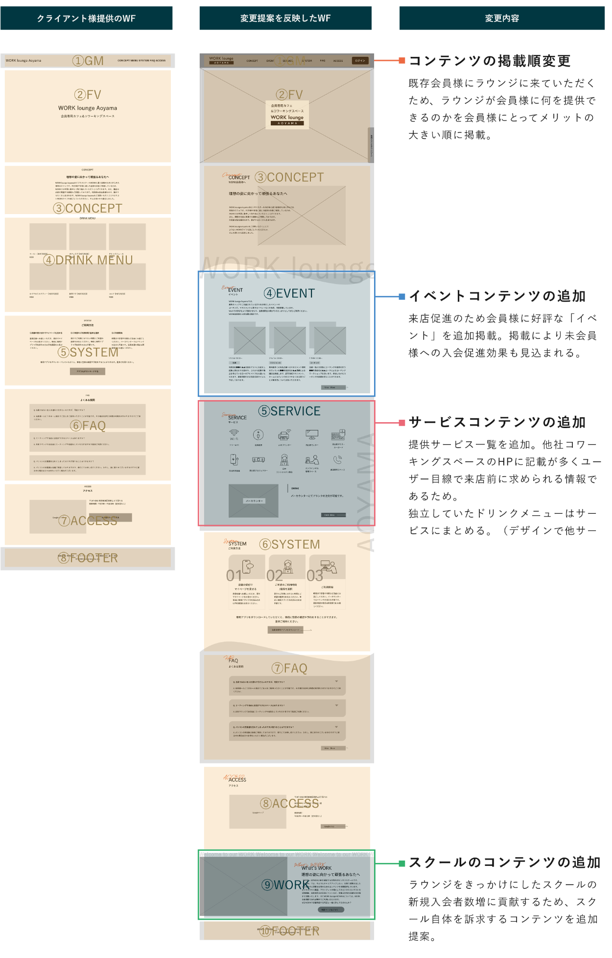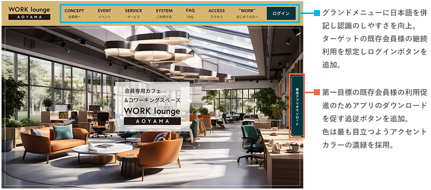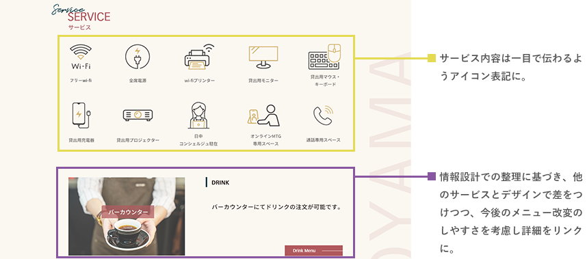 ターゲット(ペルソナ)と目的は明確なのでそこを見失わず、成果(既存会員の利用者増大、WORK会員様の増大)が最大化するようユーザーストーリーを考え、それに合うよう追加要素や構成を考えました。また要素は競合(他のカフェやコワーキングスペースのHP)と比較しつつクライアント様の優位点をアピールすることも意識しました。