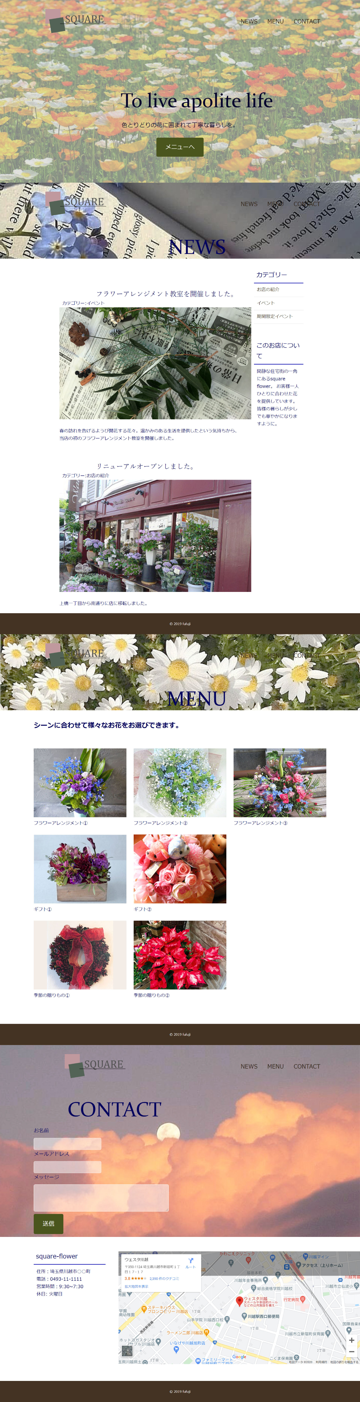 架空の花屋のHPを制作しました。喧騒な日常の中、この店に来るとどこかホッとするような、親しみがありつつ落ち着いた雰囲気がサイトから伝わるように務めました。