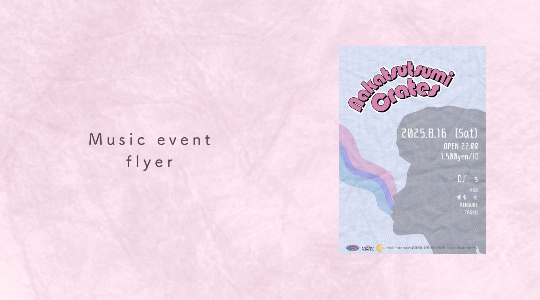 今回のフライヤーには「特にテーマは無い」ということで全く違う4種類のフライヤーを制作し提出したところ、「アーバンっぽくて良い」という評価をいただき、このフライヤーで決定しました。