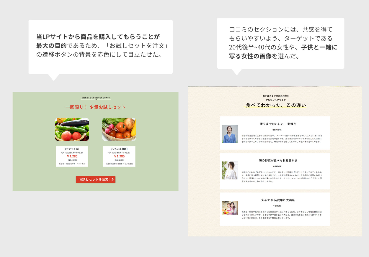 ・当LPサイトから商品を購入してもらうことが最大の目的であるため、「お試しセットを注文」の遷移ボタンの背景を赤色にして目立つようにした。