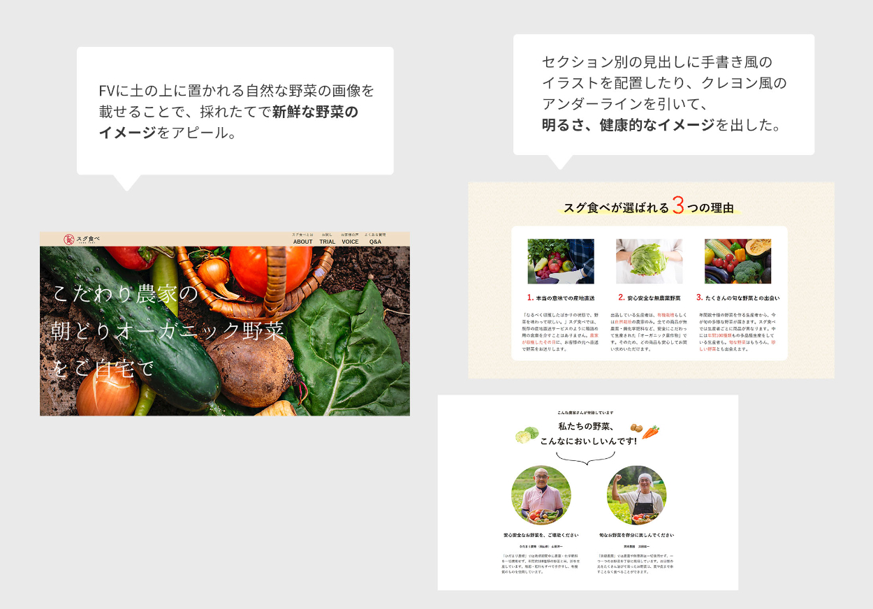 ・FVに土の上に置かれる自然な野菜の画像を載せることで、採れたてで新鮮な野菜のイメージをアピールした。