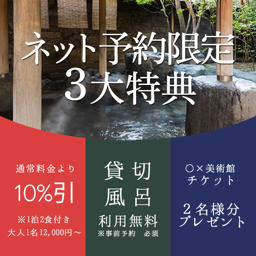 【架空案件】温泉旅館のキャンペーンバナー kimu Webデザイナー OVERVIEW ホームページ掲載用のネット予約限定の3つの特典を告知するバナー 〜ターゲット〜 30〜40代の男女 温泉付旅館でゆっくり過ごして、周辺を観光したい方を意識 〜ポイント〜和風のデザインにすることカワフルな色使いにして目を引くように