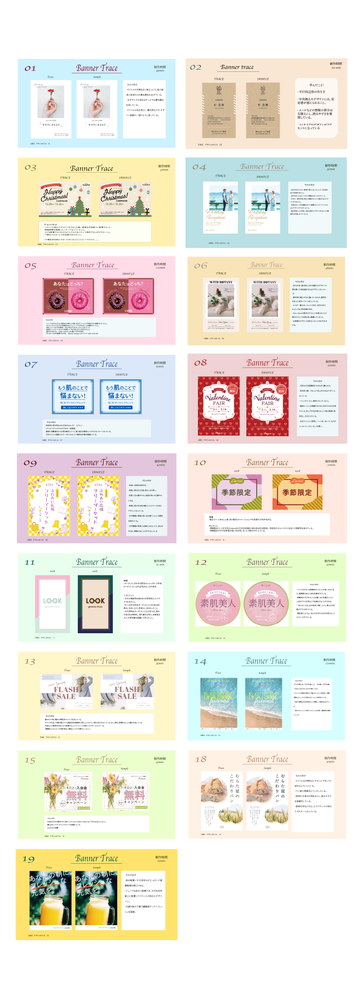 バナートレース (「デザインのドリル」の1〜19まで) ロンビひなこ 動画編集者、WEBデザイナー、イラストレーター OVERVIEW デザインの引き出しを増やすため、感覚的にではなく、目的をもったデザインをするための言語化の練習として、「デザインのドリル」を使ってバナートレースに挑戦していきました。