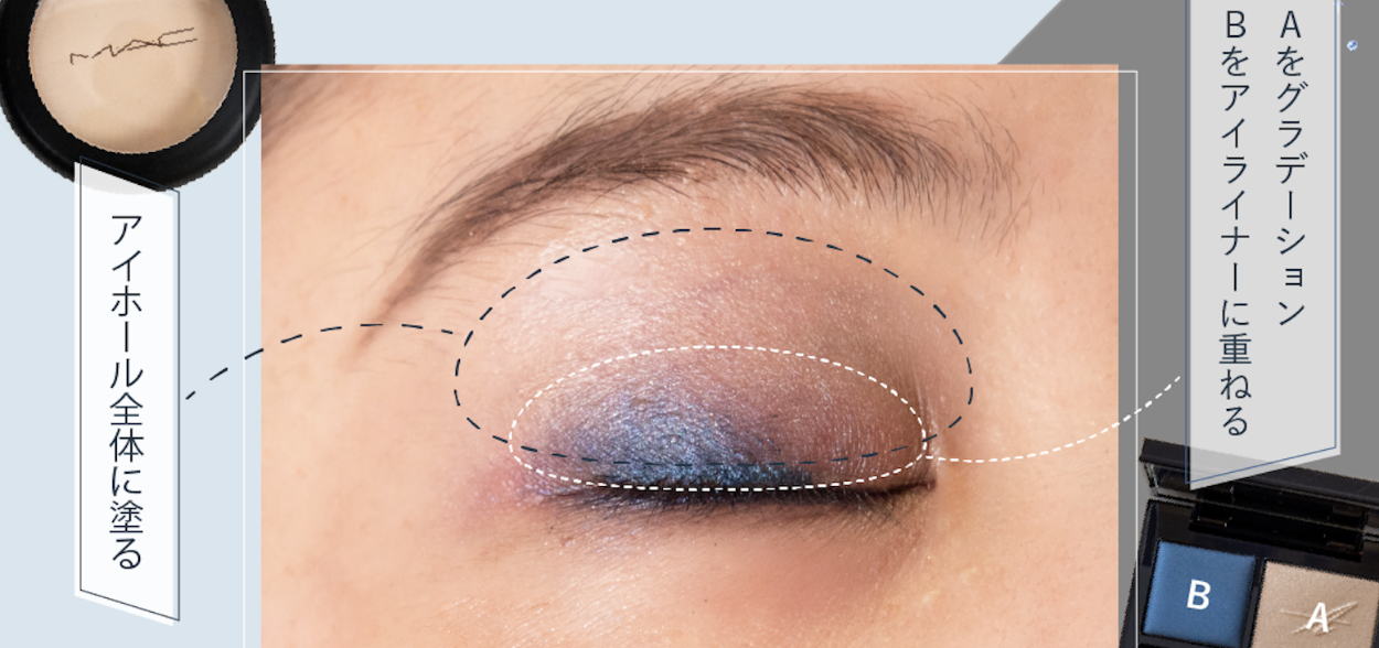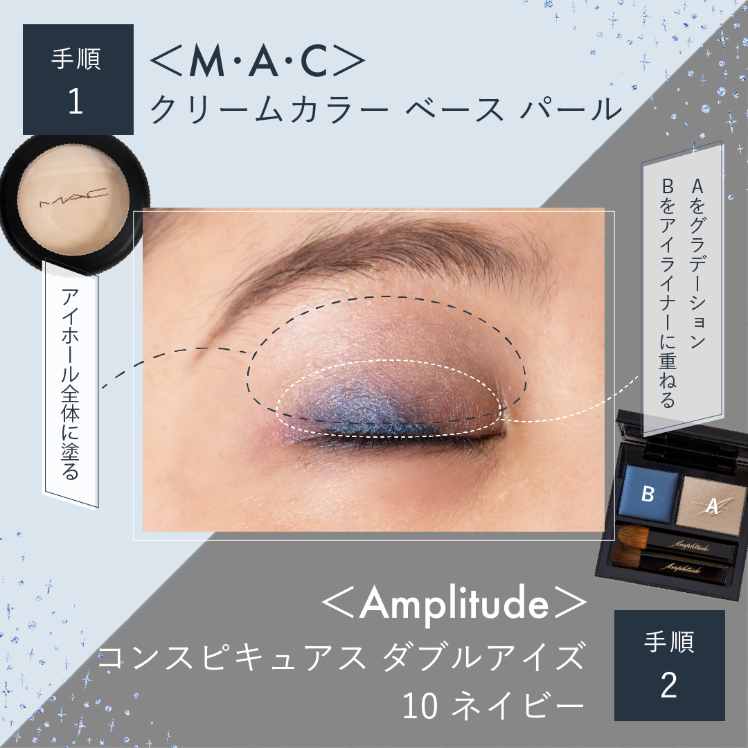meecoさんのトンマナカラーの中から「ネイビーメイク」のイメージに合う水色とグレーの2色を選択し、「2つのアイテムを使って」というテーマに合わせてバナーの画面をそれぞれ異なる2分割にするように配置しました。