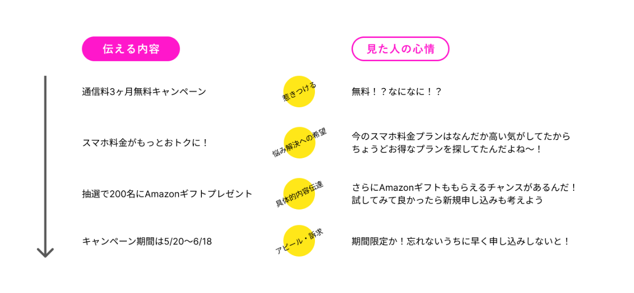 ・コーポレートカラーのビビッドピンク、文字色等に白、そしてこちらも「現状よりも良くなる、お得感ある!、明るい」といったことを連想させるような色で、コーポレートカラーとのバランスも考えた結果黄色を採用しました。