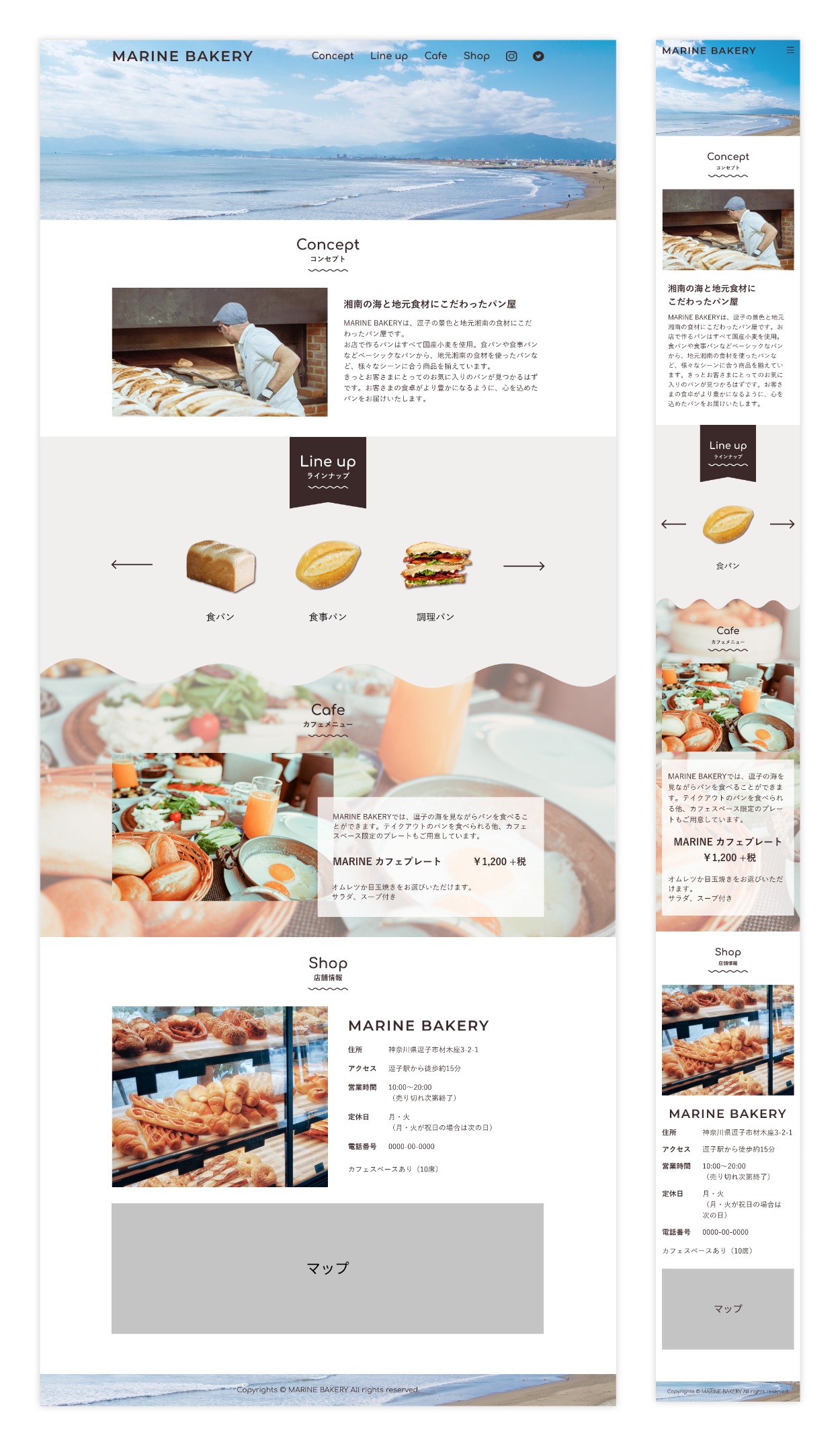 - 海辺のパン屋らしさを出すため、湘南の海の写真をメインビジュアルとフッターに使用し、CAFEの背景の上部を波型にしました。