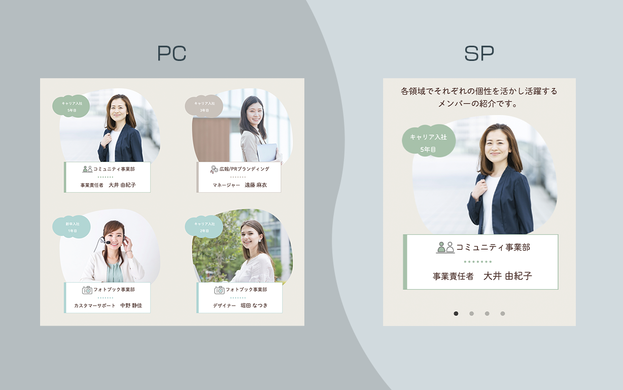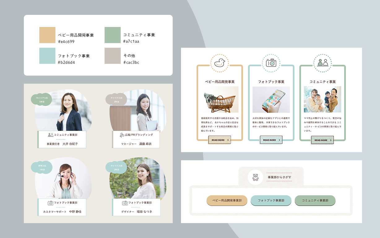 ・事業で色分けを行い、メンバー紹介や募集内容でも情報が入りやすいようにしました。