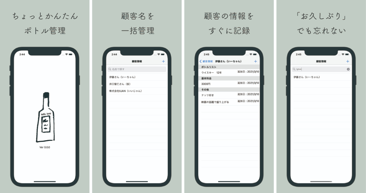 【ボトル管理アプリ】BottleKeep ゆうと エンジニア OVERVIEW 飲食店向けボトル管理業務支援アプリの開発・運用 簡単な顧客情報の管理ができます。 YEAR 2021 コロナで大変な思いをしている飲食店の力になりたいこの思いで出来上がったのが【BottleKeep】です。誰でも簡単に操作出来るように余分なUIは削ぎ落とし、ほぼ標準機能で賄う形で制作しています。git hub : BottleKeep WEBSITE
