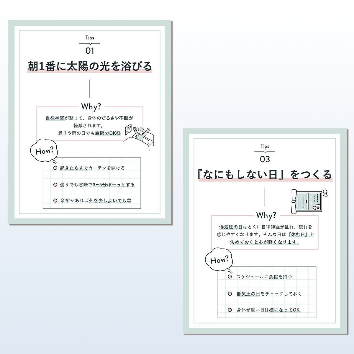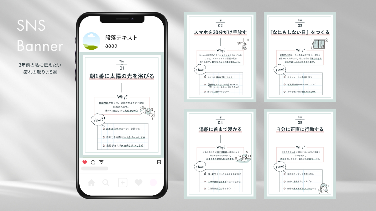 目的:効率の良い休み方を紹介し、天気やストレスが原因の疲れに悩むユーザーの保存を促す