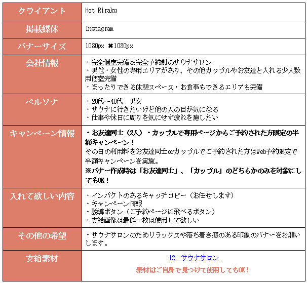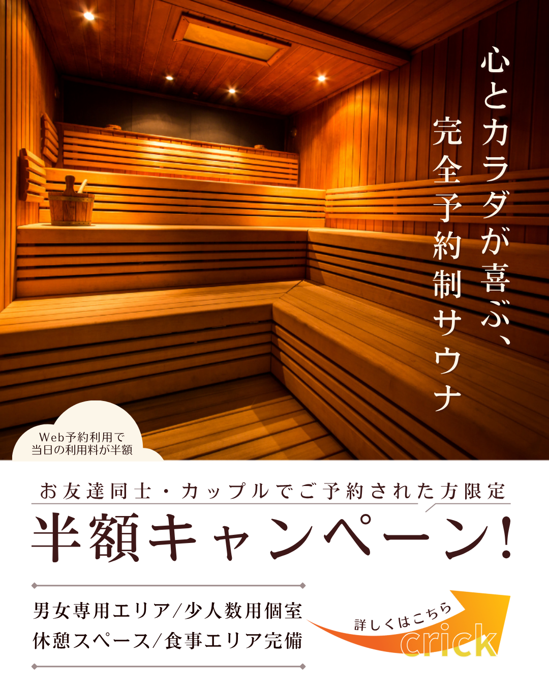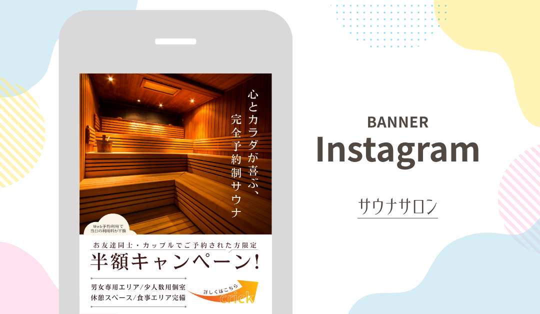 ⋆ 周りを気にせずサウナを使用したい方に向けてのバナーのためキャッチコピーに「完全予約制サウナ」の言葉を選び、写真には人物を入れないことで落ち着いて利用できる空間であることをアピールしました。