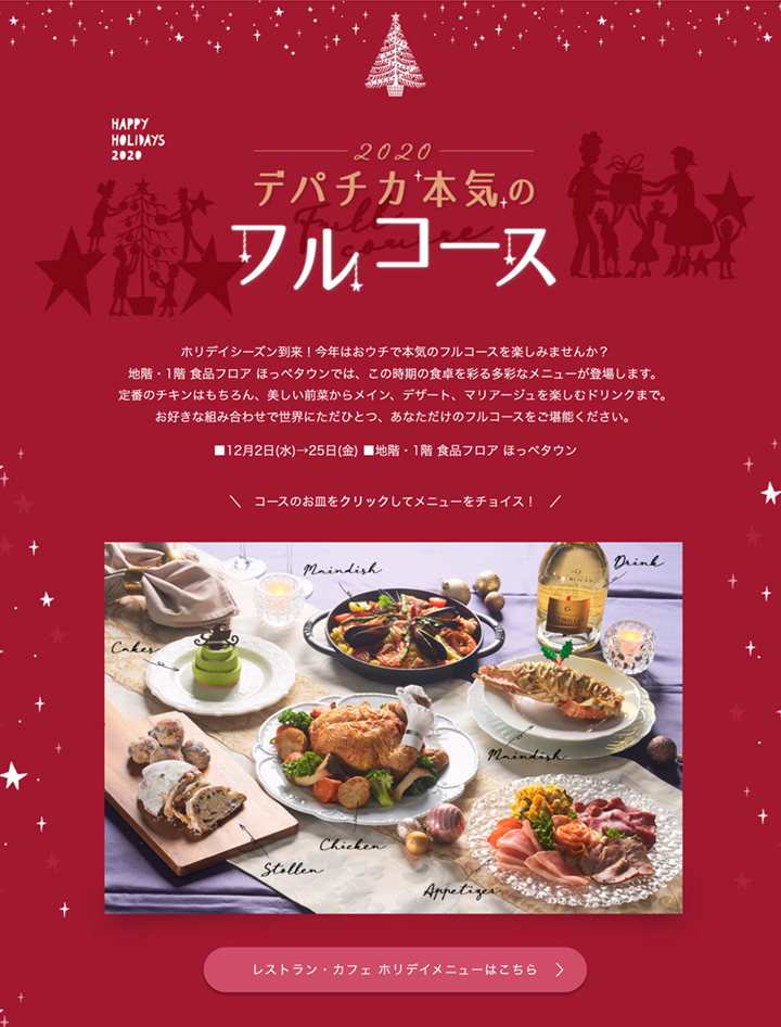 大丸東京店様が提案するクリスマスフルコースメニューを紹介するサイト。コロナ禍当時、クリスマスをおウチで楽しんでもらいたいという想いを受け制作しました。画像のお皿をクリックすると、モーダルウィンドウが出てきて販売商品が見られる仕組みになっています。