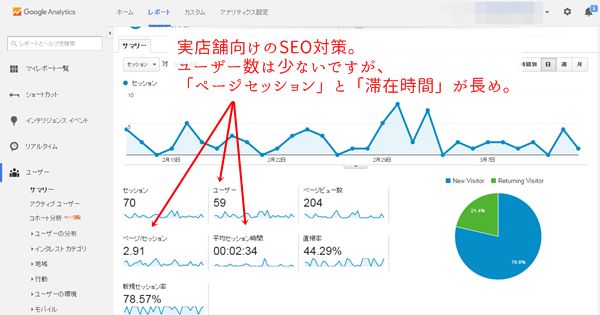 しかしながら、「ページセッション数」は2.91、「平均セッション時間」は2分34秒と、良く回遊され、読まれるサイトとなりました。