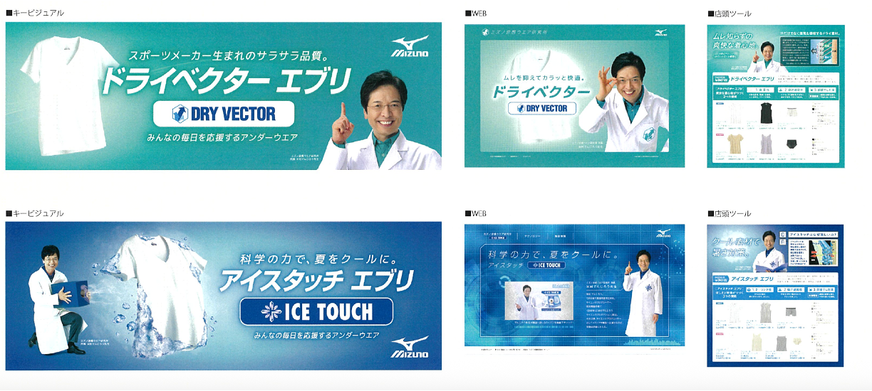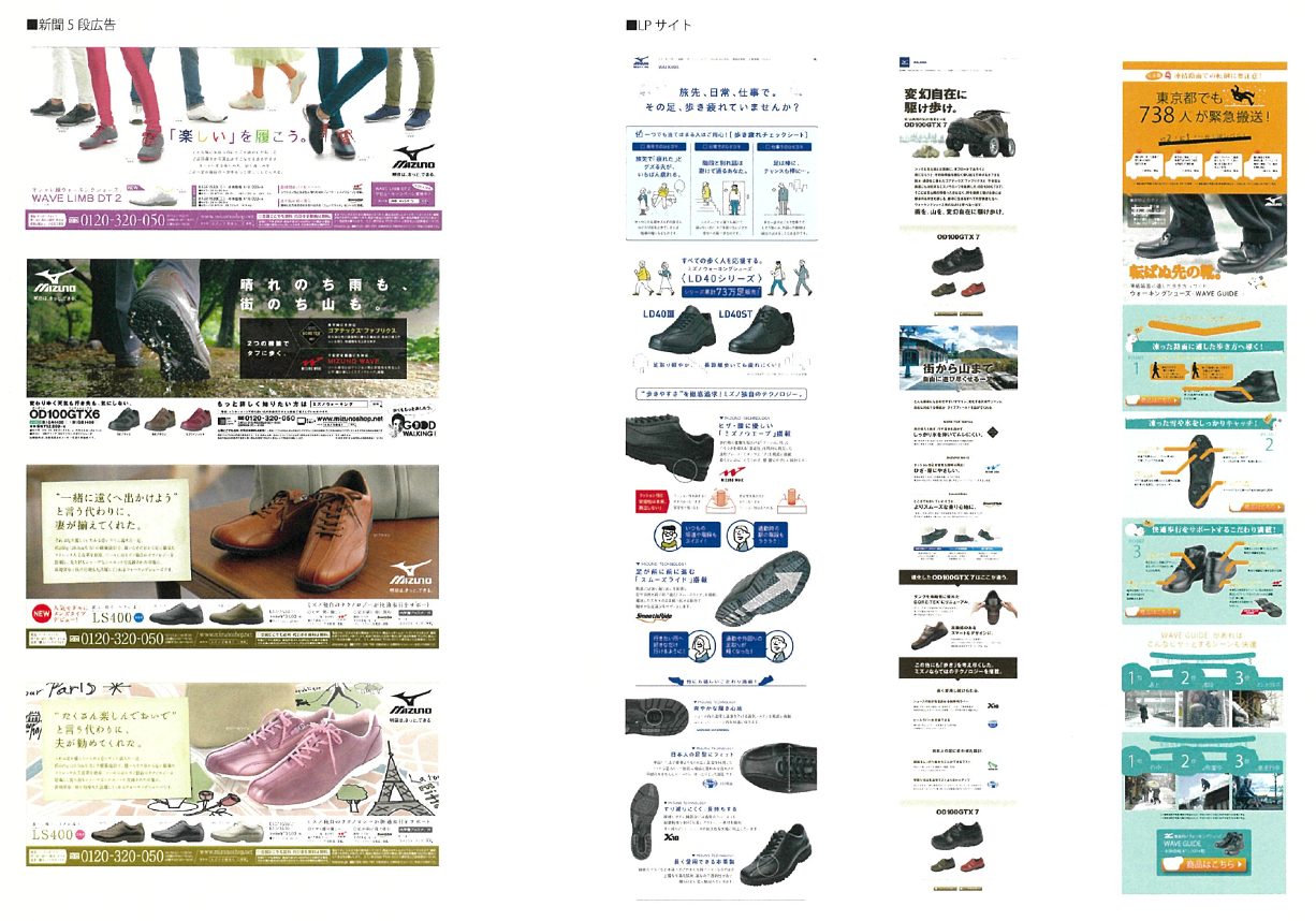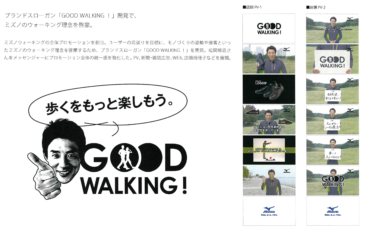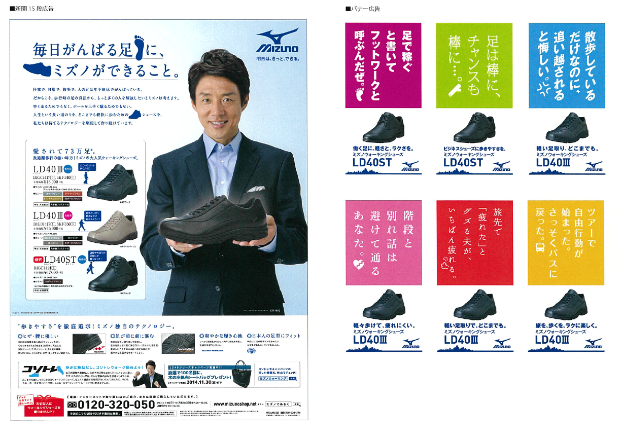 ウォーキングシューズの全体プロモーションを長年担当。ミズノのウォーキングシューズはカテゴリーも多く、新商品ごとの新聞広告や WEB、店頭 POP などを担当。アドバイザリースタッフとして松岡修造さんを起用。