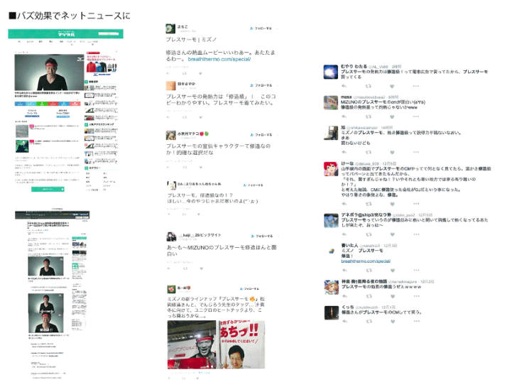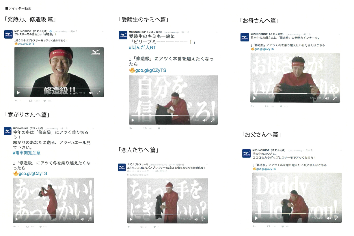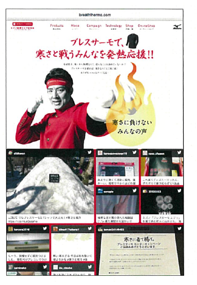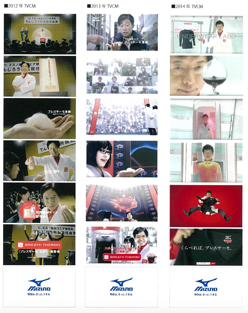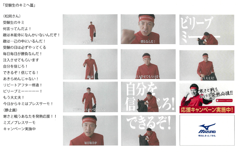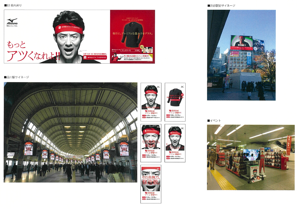 吸湿発熱ウエアのパイオニア、ミズノブレスサーモの全体プロモーションを長年担当。競 合商品ひしめく中、発熱力 No.1 の機能性で差別化を図るため、2012 年より米村でんじろ う先生を起用。ブレスサーモのズバ抜けた発熱力をユニークな実験で実証してきた。2016 年は、このでんじろう先生の信頼感に加え、新商品のデビューを盛り上げるため日本ーア ツい男·松岡修造さんを起用。「寒さと戦うあなたを発熱応援」をテーマに、トレインチャ ンネルや中吊り広告をはじめ、サイネージ、WEB、SNS、イベントなど立体的なプロモーショ ンを実施した。
