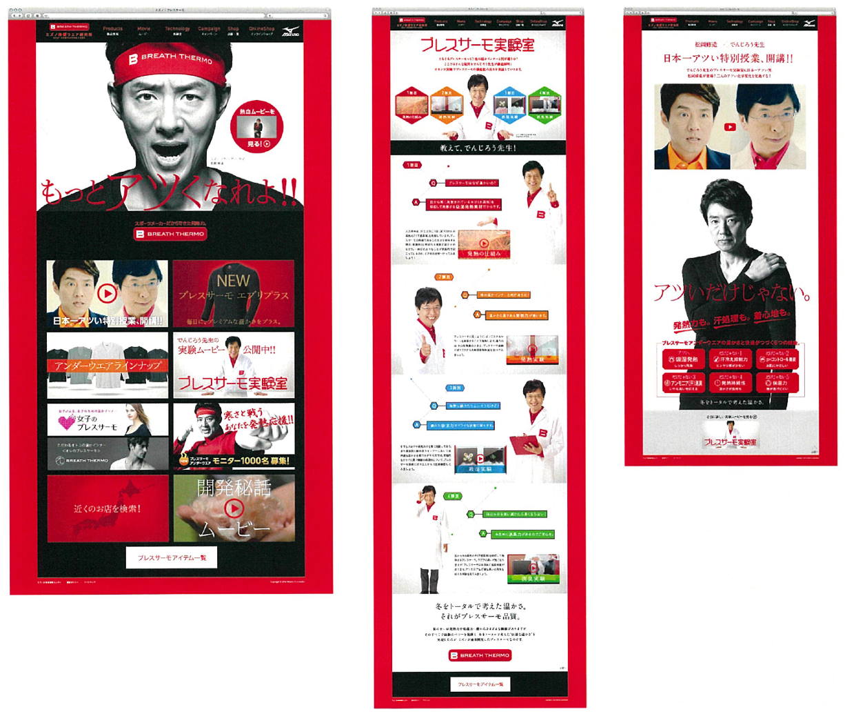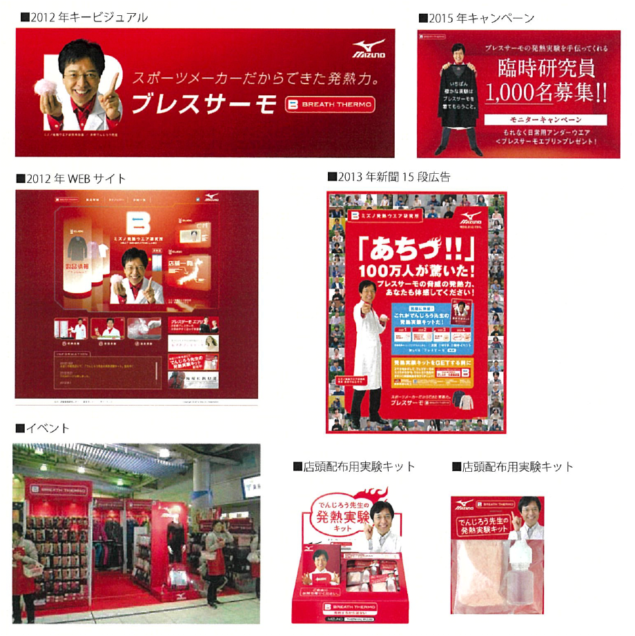 でんじろう先生と共に、ブレスサーモの機能を視覚化する、ユニークな実験を共同開発。 またブレスサーモの発熱力を手軽に体感できる発熱実験キットを作成。「100万人体感」 や「日本列島総発熱体感」「発熱品質宣言」など毎年プロモーションテーマを設け、 TVCM、WEB、店頭 POP、イベント、チラシ、郵便局での実験キット配布など立体的なプ ロモーションを展開した。