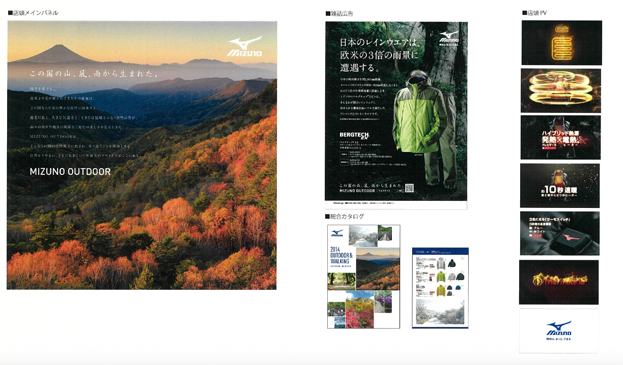 ミズノアウトドアの全体プロモーションを担当。「本格アウトドアブランド」としてのイメージを構築するため、2011 年より米国の
