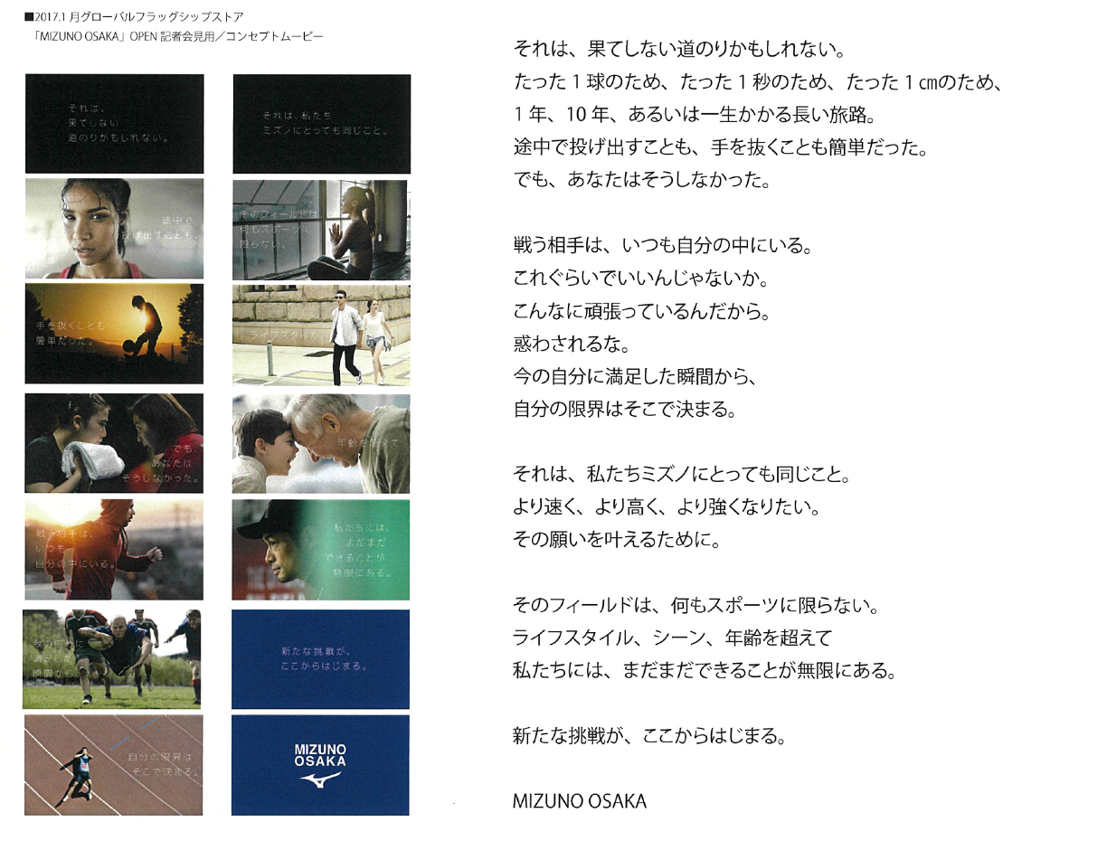 ミズノの第二のビジネスの柱、ライフスタイルスポーツ事業部全体のコンセプト開発のお仕事。一般生活者へのミズノとしての宣言、そして変革期にあるミズノ全社員へのインナーメッセージとしての役割を担った。