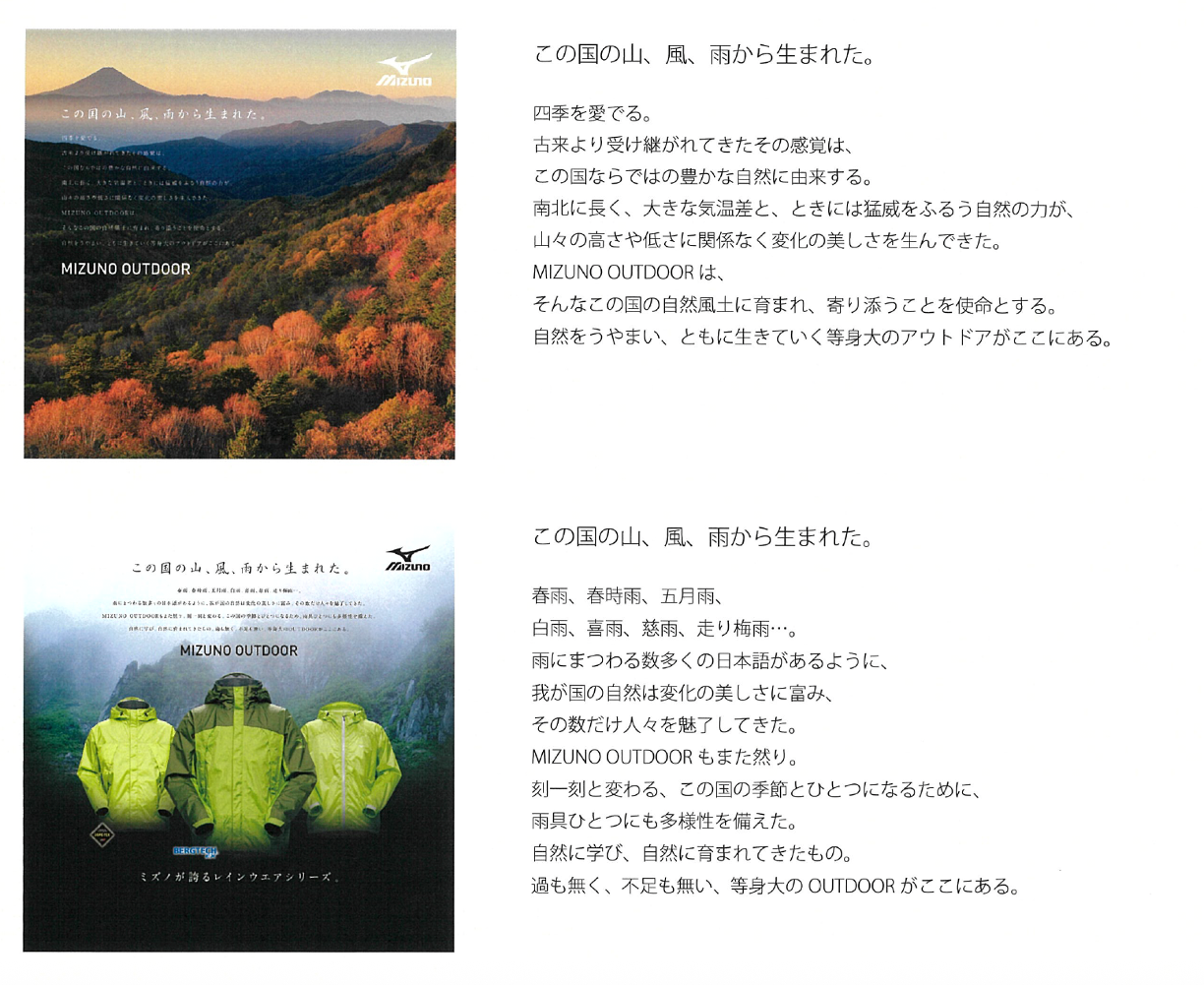 求へと。ブランドスローガン「この国の山、風、雨から生まれた。」をはじめ、雑誌広告、PV、店頭ツール、カタログなど引き続き全