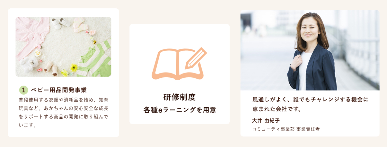 ベビー用品をメインとし、ママの育児をサポートするコミュニティ事業や家族みんなが幸せになるフォトブック事業を展開している。