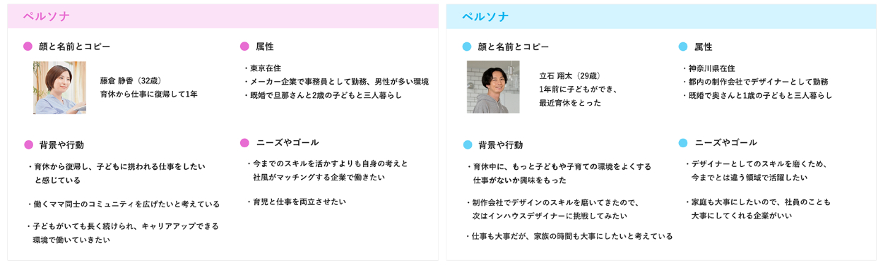 クライアントの課題を解決するため、企業の世界観を幅広い人に共感をしてもらうために、2人の男女のペルソナを設定しました。