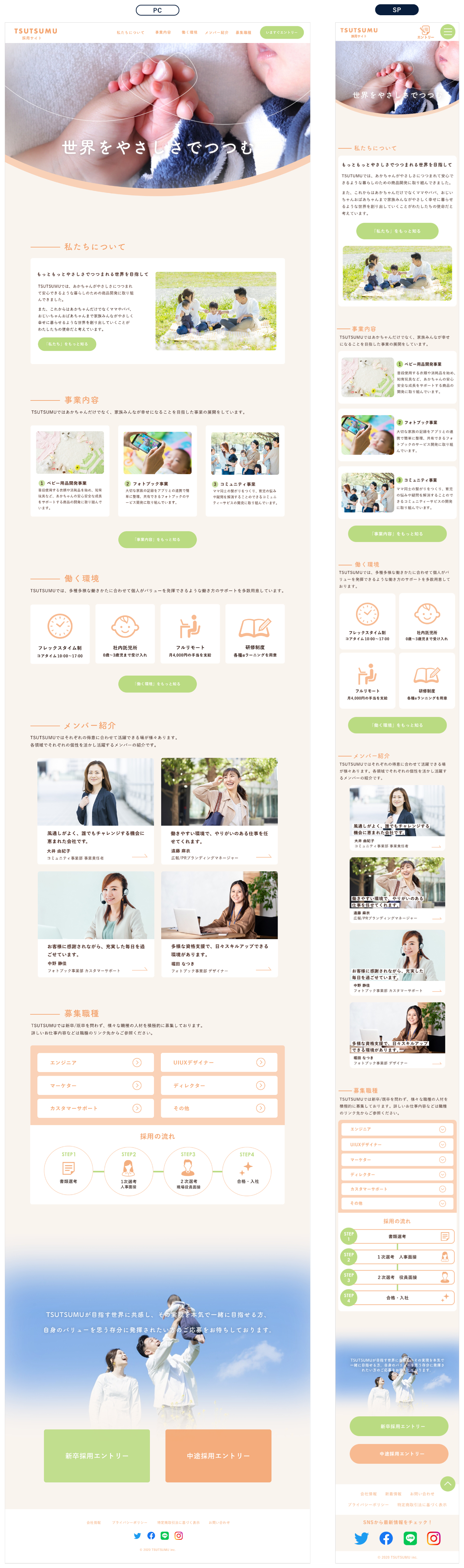 縦に読み進めていくSPサイトは、縦長になりすぎて閲覧中の離脱を防ぐよう、「事業内容」「働く環境」「採用の流れ」のデザインをコンパクトにしました。