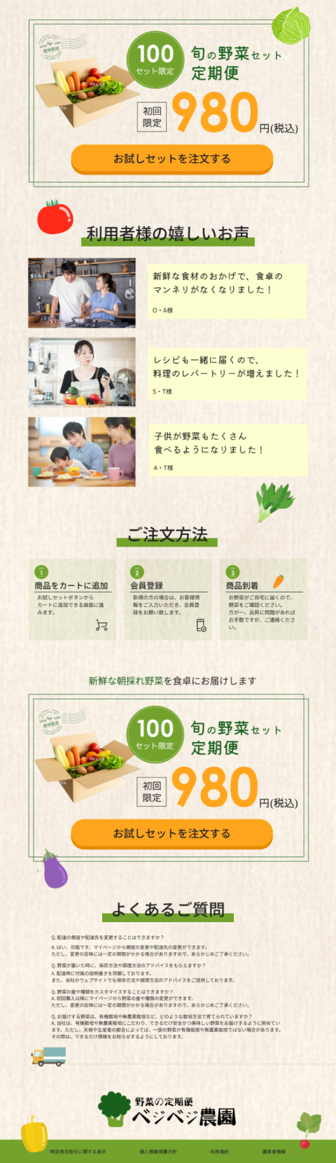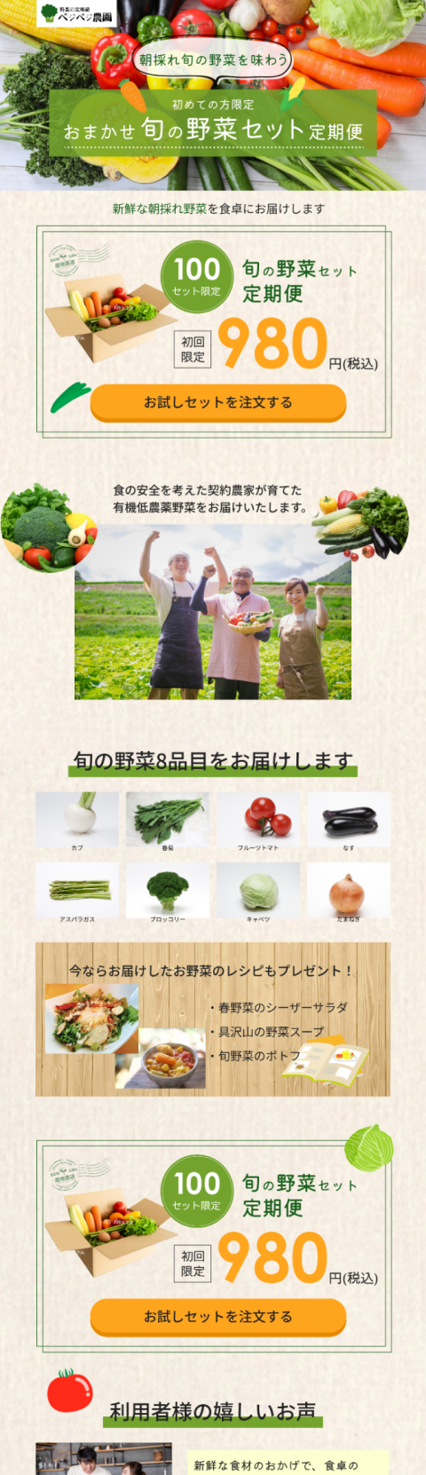 ・生産者の写真と一緒に採れたてのたくさんの野菜の写真を配置。新鮮な野菜がたくさん届くことをイメージできるようにしました。