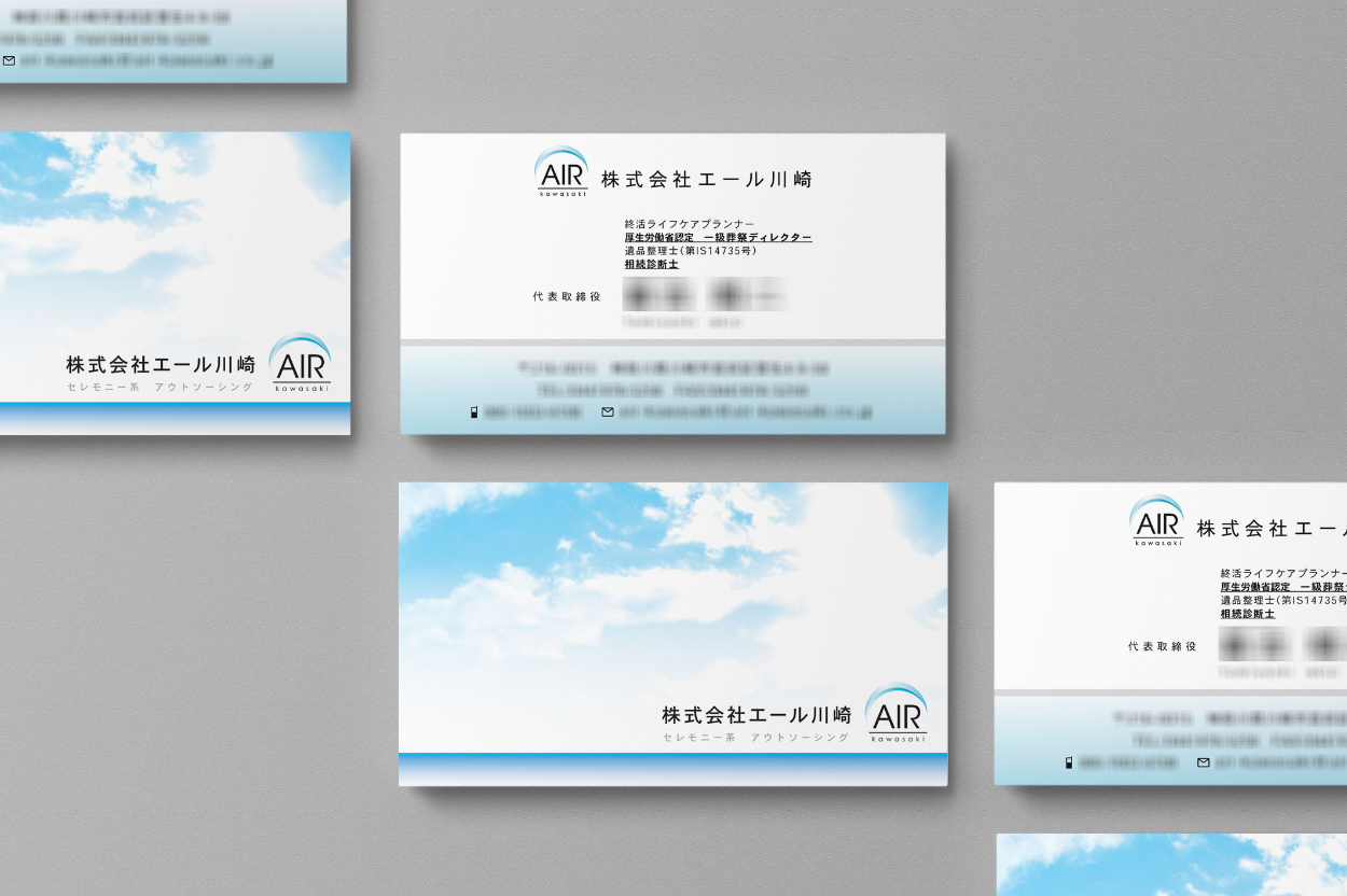 【ご要望】 名刺を新しく作るのにロゴマークも作って欲しい。「AIR」「air」はこだわりがないので、どちらかバランスをみて採用したい。葬儀の落ち着いたイメージではなく、明るいイメージがよいです。空や虹のような雰囲気が好き。