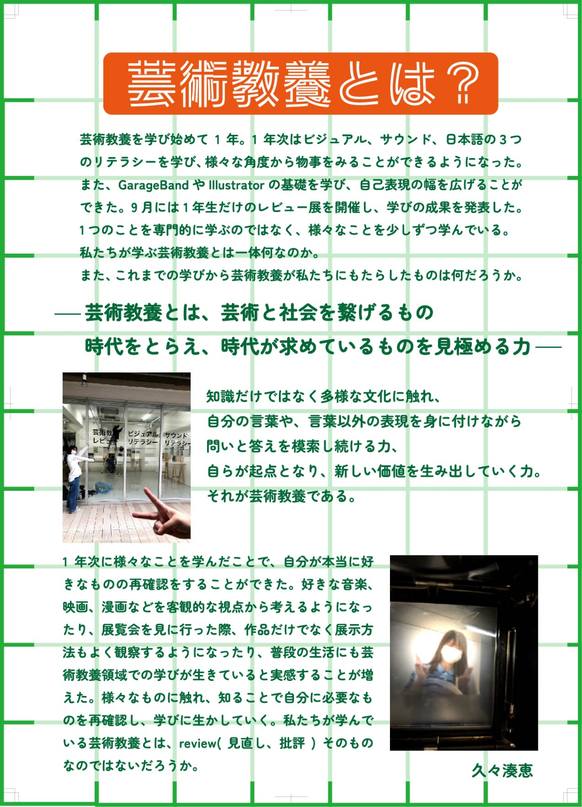 本作品は私が大学で学んできた「芸術教養」とは何か について説明したもので、文字のサイズや、余白の使い方を工夫して、自分が1年間で学び、吸収してきたことを如何に多くの人に分かりやすく伝えられるかを考えて制作しました。