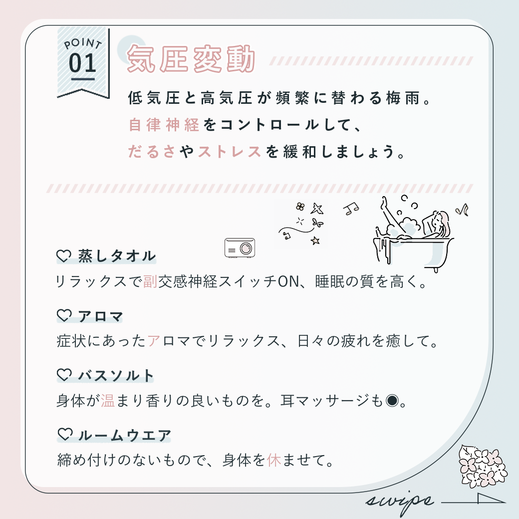 ・ターゲット像から、①オシャレにも気を遣っている②仕事の疲れを癒したい③仕事も頑張っている④梅雨ダルに悩んでいる…など細かく設定し、ターゲットに刺さるようなデザインや内容を意識させました。