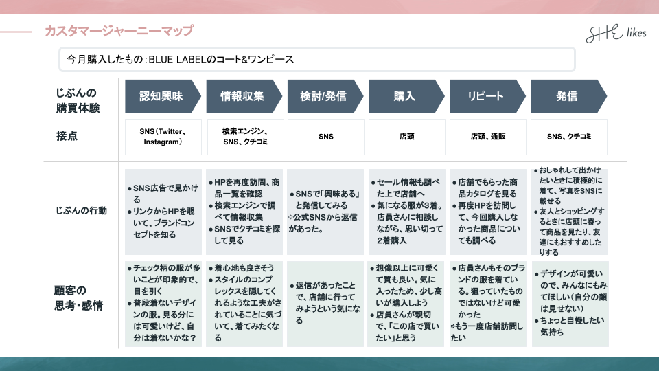 カスタマージャーニーマップは初めてやりましたが、自己分析にもなって楽しかったです。