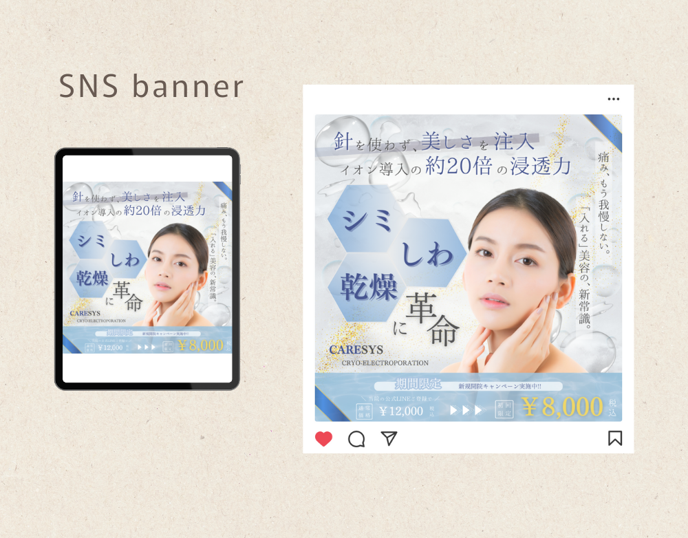 20代~50代の美容意識の高い女性や人前に出る職業の人をターゲットにした、美容施術ケアシスのSNS広告です。