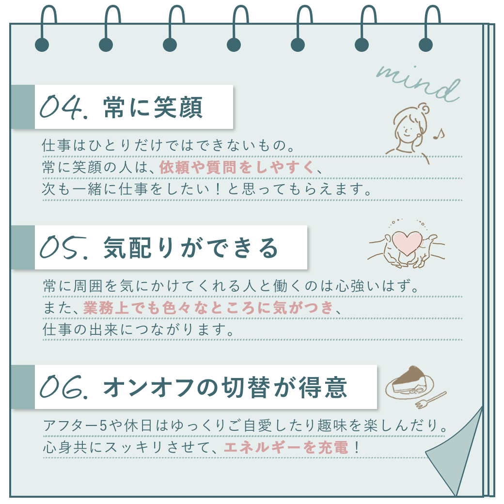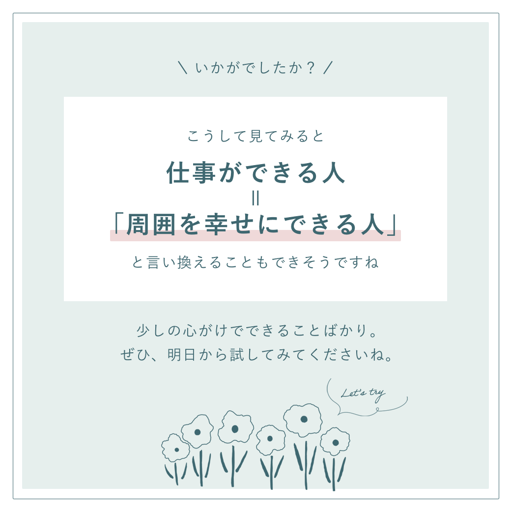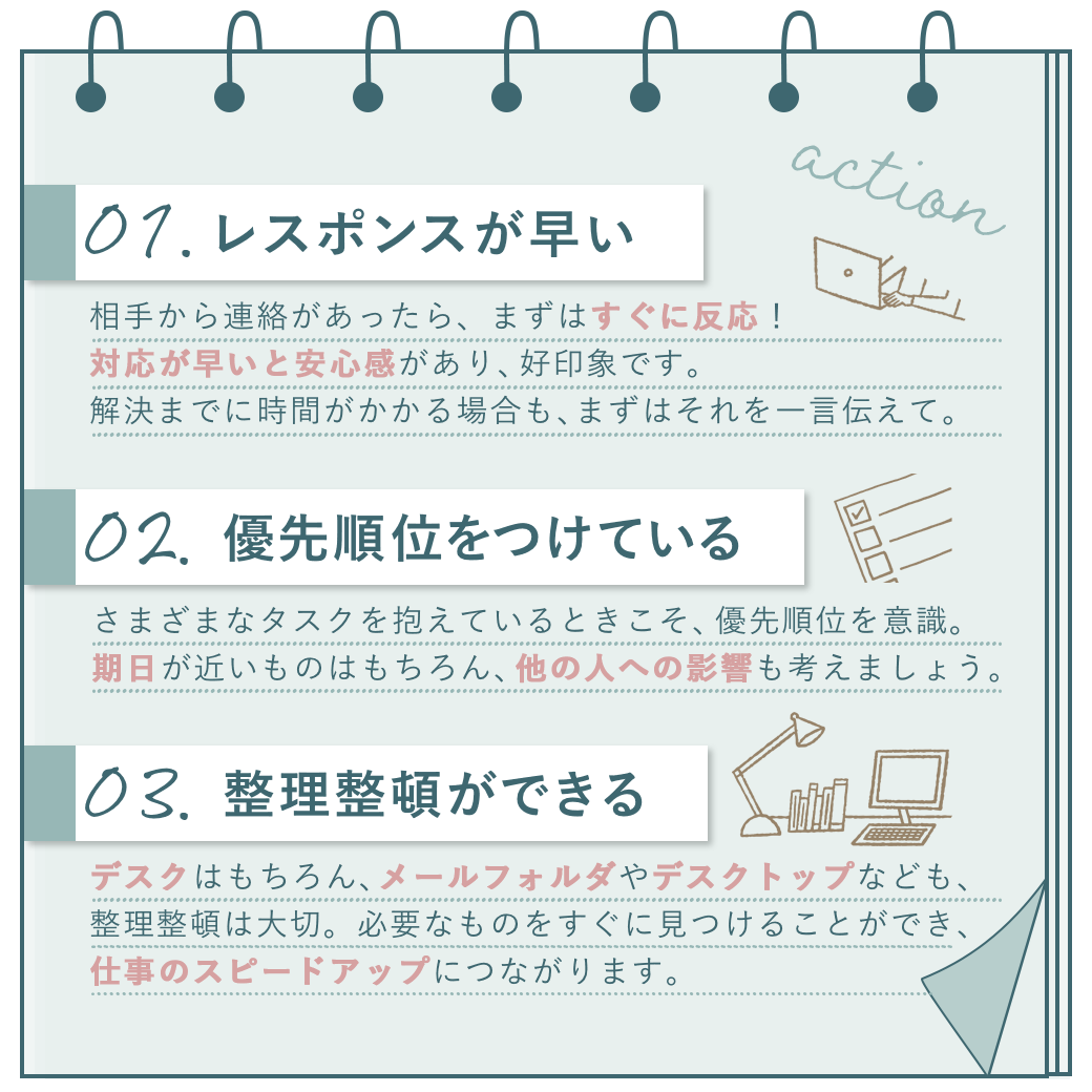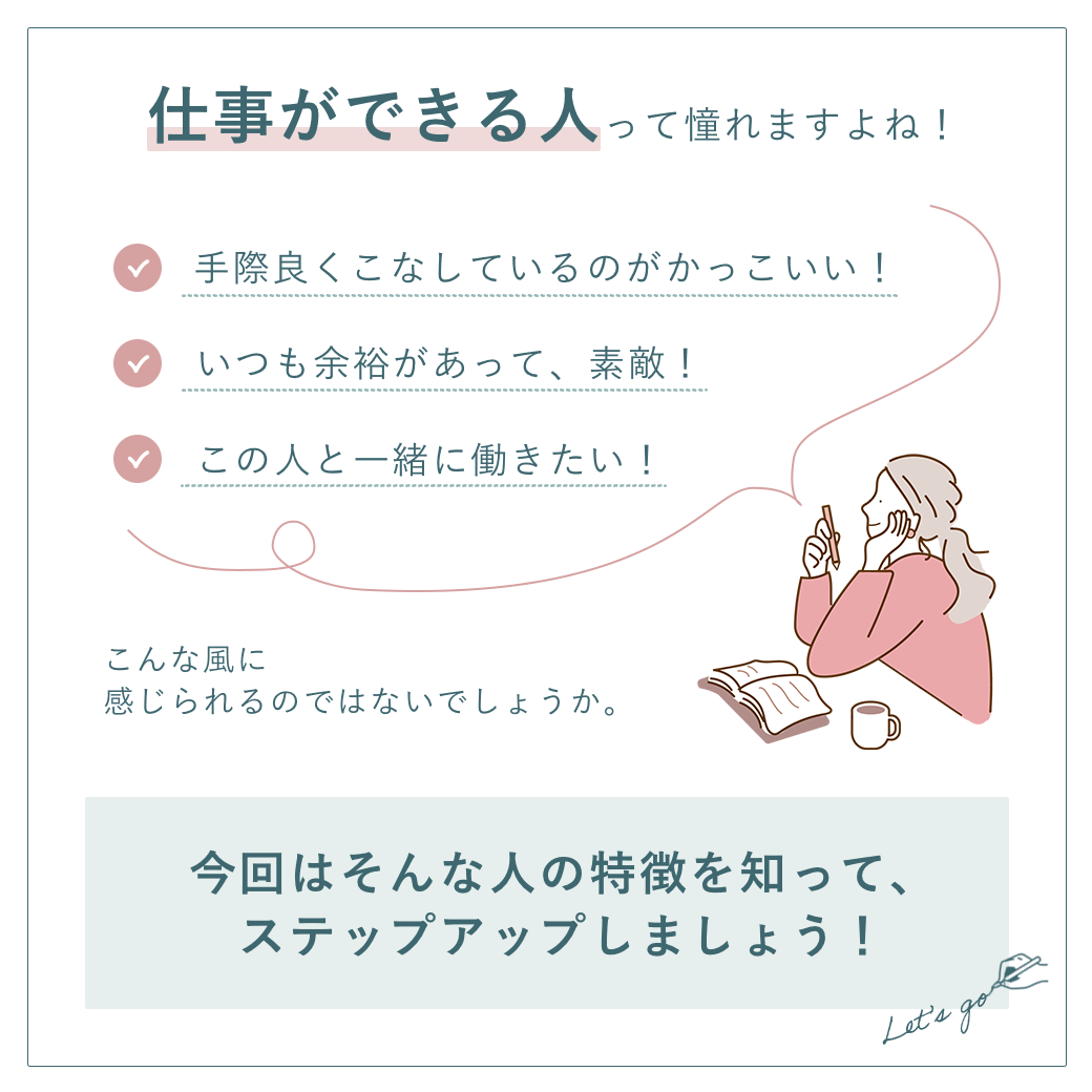 - 2枚目で仕事ができる人に憧れる人(=読者)の女性イラストを配置し、3枚目以降はその人がメモをとるというストーリーで作成しました