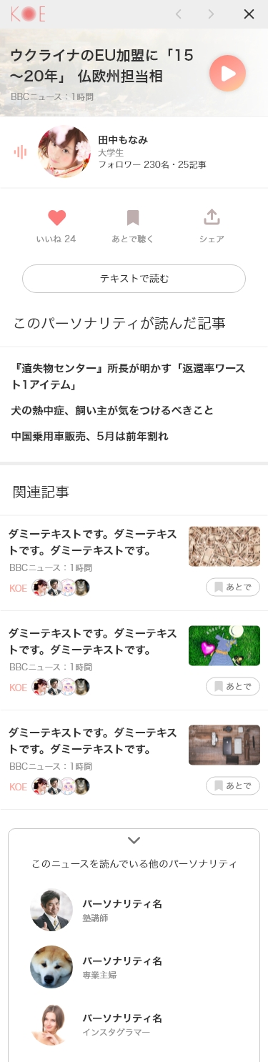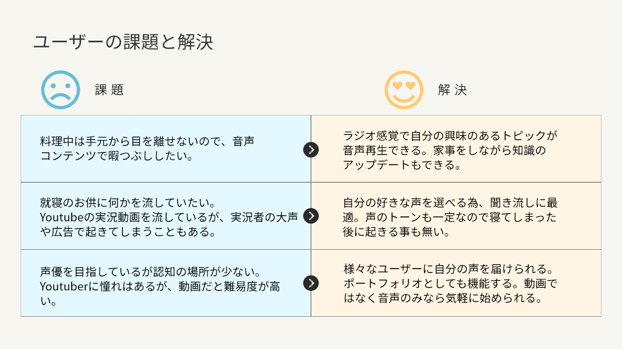 ニュースアプリの口コミで「洗い物などの家事の最中は目が離せないが、考えることは少ないので読み上げ機能があると助かる」という主婦の方の口コミを見たことがきっかけです。機械音声が肉声になって、お気に入りのクリエイターの声でニュースを聴くことができたら、いつもの生活が少し豊かになるのではないでしょうか。