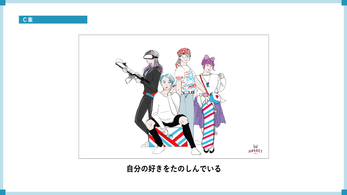 MAGNET by SHIBUYA109が色んな文化・人・物が集まる場所であると考え、「もっと自由に、欲しがろう。」をコンセプトに3つの案を提案しました。